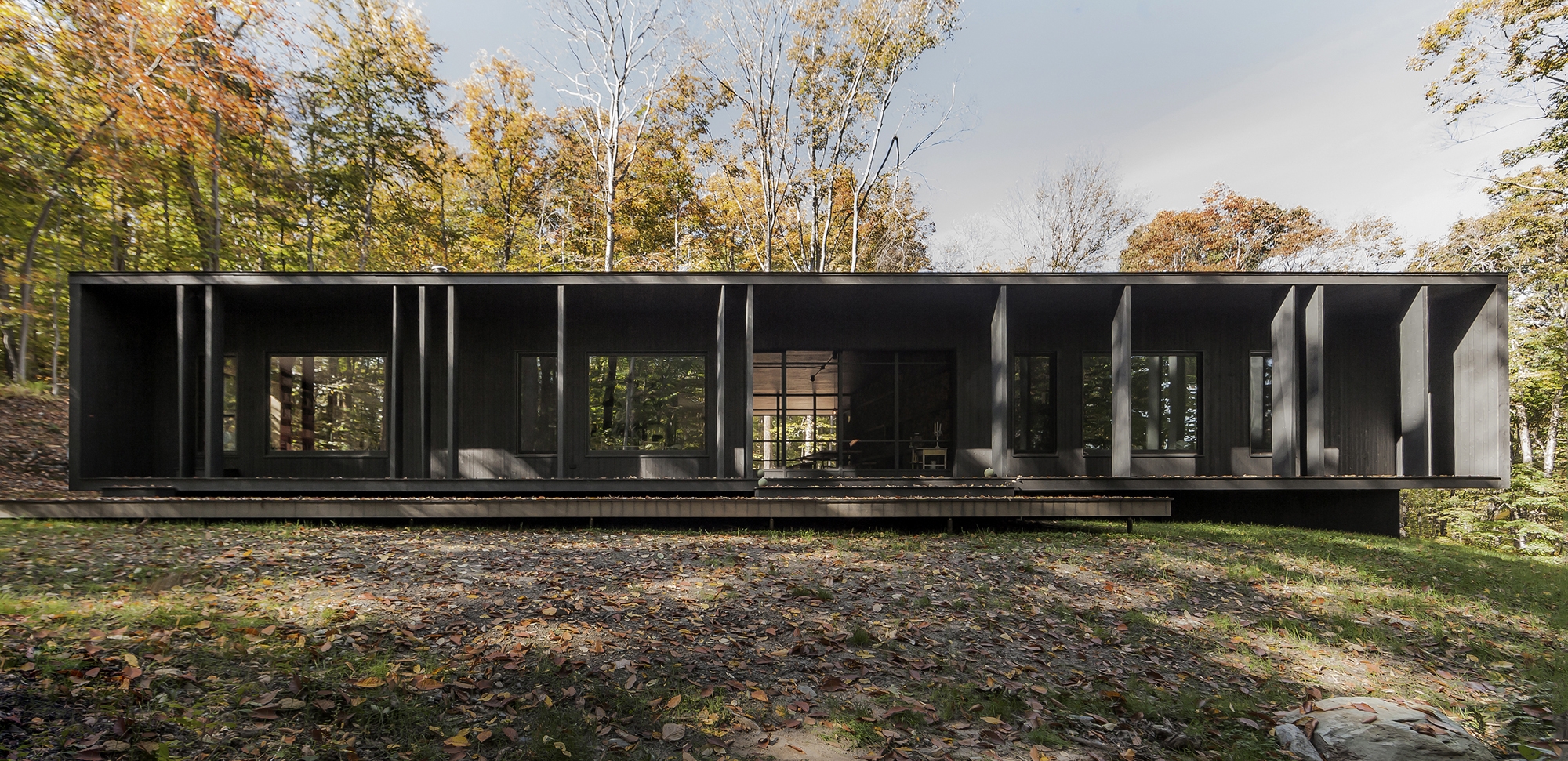 Overt city dwellers, the clients of this chalet wished to build a secondary residence in woodlands nearing Montreal for their leisurely use throughout weekends and holidays. They then found a site set on the eastern face of mount Pinnacle in the Eastern townships of Quebec. Their requirements were modest: an easy-to-maintain residence in which its spaces were largely open to the surrounding nature, and be built from Cross-Laminated Timber (CLT), which would, in turn, project a robust and brutish image.