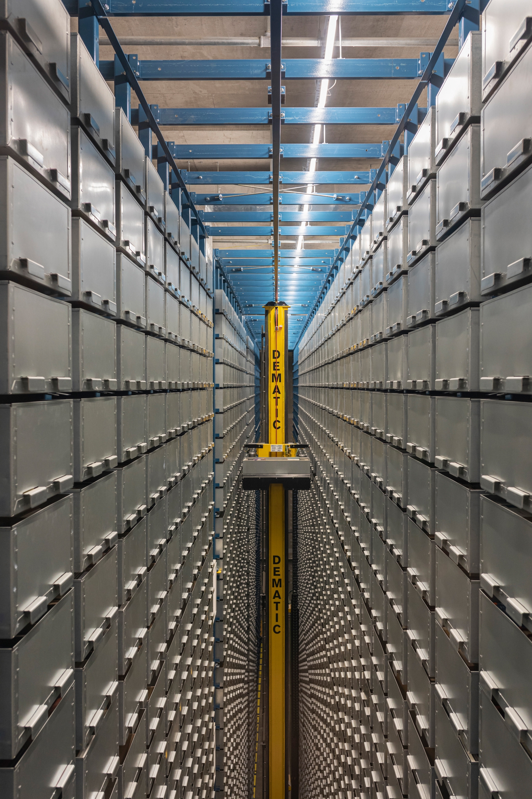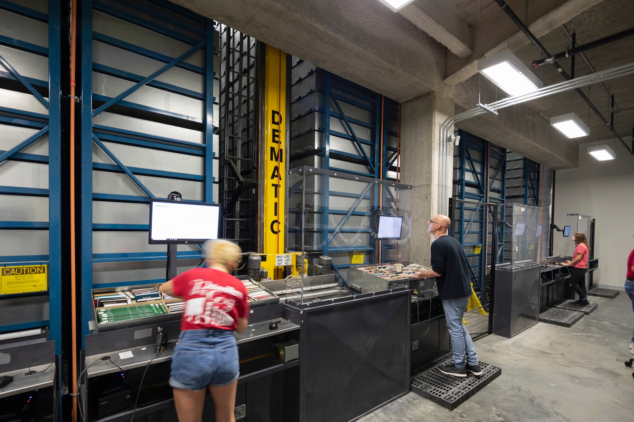 At the base of the main stair, the one-stop service desk provides the first interface between library staff and students, and facilitates their access to the library collection, stored primarily in the high-density automated storage and retrieval system (ASRS), affectionately termed the ‘BookBot.’ At fifty-seven feet tall, it spans three levels of the building and currently stores 1.5 million volumes with a capacity of nearly 2 million, allowing holdings previously housed in off-site deep storage to be relocated on-site. By drastically reducing the space required for book storage while also expanding access to the Library’s collection, the BookBot enables increased space for collaborative learning, academic resources, and individual study space.