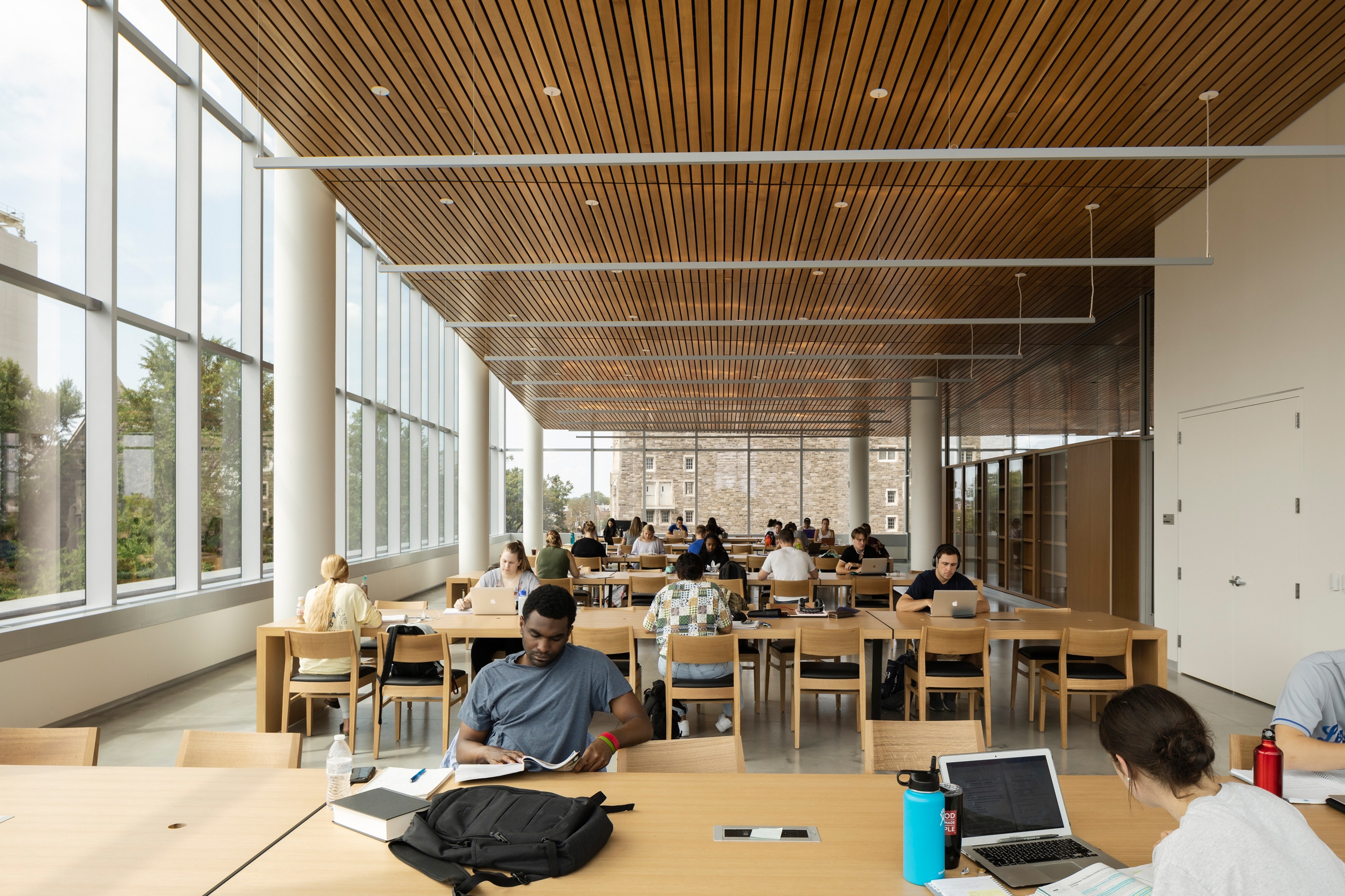 While the library offers a uniquely diverse space program tailored to the emerging needs of contemporary students, it also offers the focused research experience of traditional academic libraries. The serene, sun-filled fourth floor encourages visitors to meander through the stacks of the library’s browsable collection. Roughly 200,000 volumes anchor the center of the room, while more private study spaces line its perimeter. Balancing the north and south ends of the fourth floor are two expansive reading rooms, dedicated to graduate, faculty, and undergraduate study.