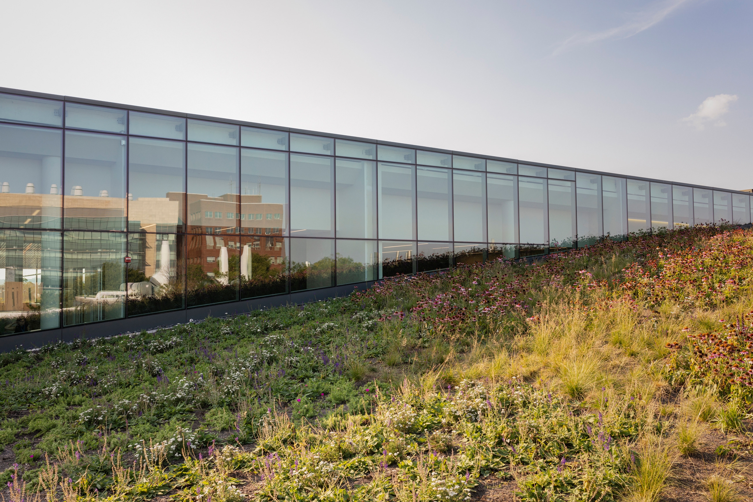 Glazed on all four sides with glass, with views out to the lushly planted green roof, the fourth floor offers an unexpected retreat that feels embedded in nature. Conceived as an amplified meadow landscape, ornamental grasses and herbaceous perennials form the foundation of these reading gardens, through which drifts of curated flowering species and bulbs emerge punctuating color and interest throughout the year. The roof gardens, composed of upwards of 15 different species, provide rich urban habitat for pollinators and a calming visual foreground to the views of the campus and city beyond from the interior of the library.