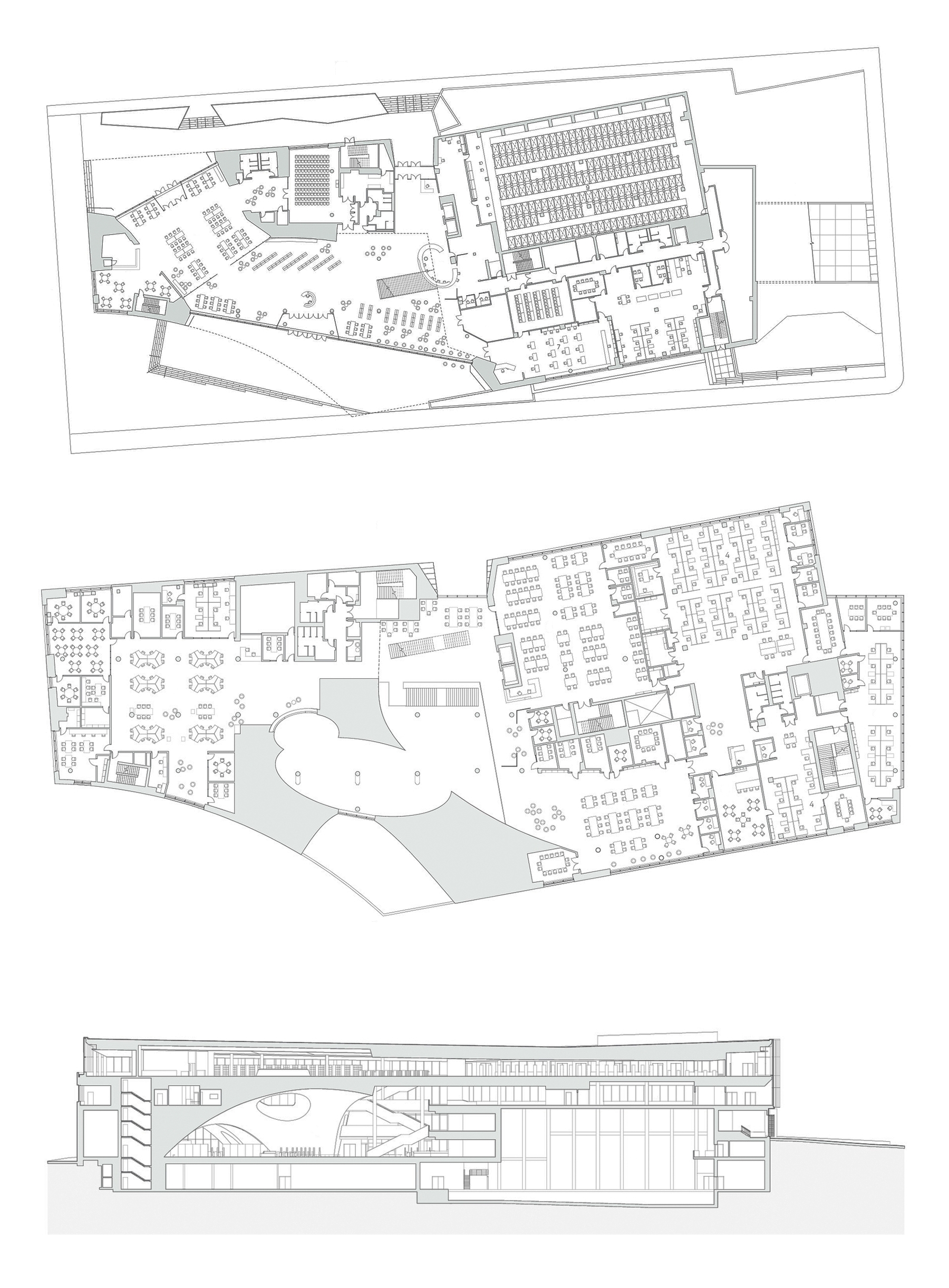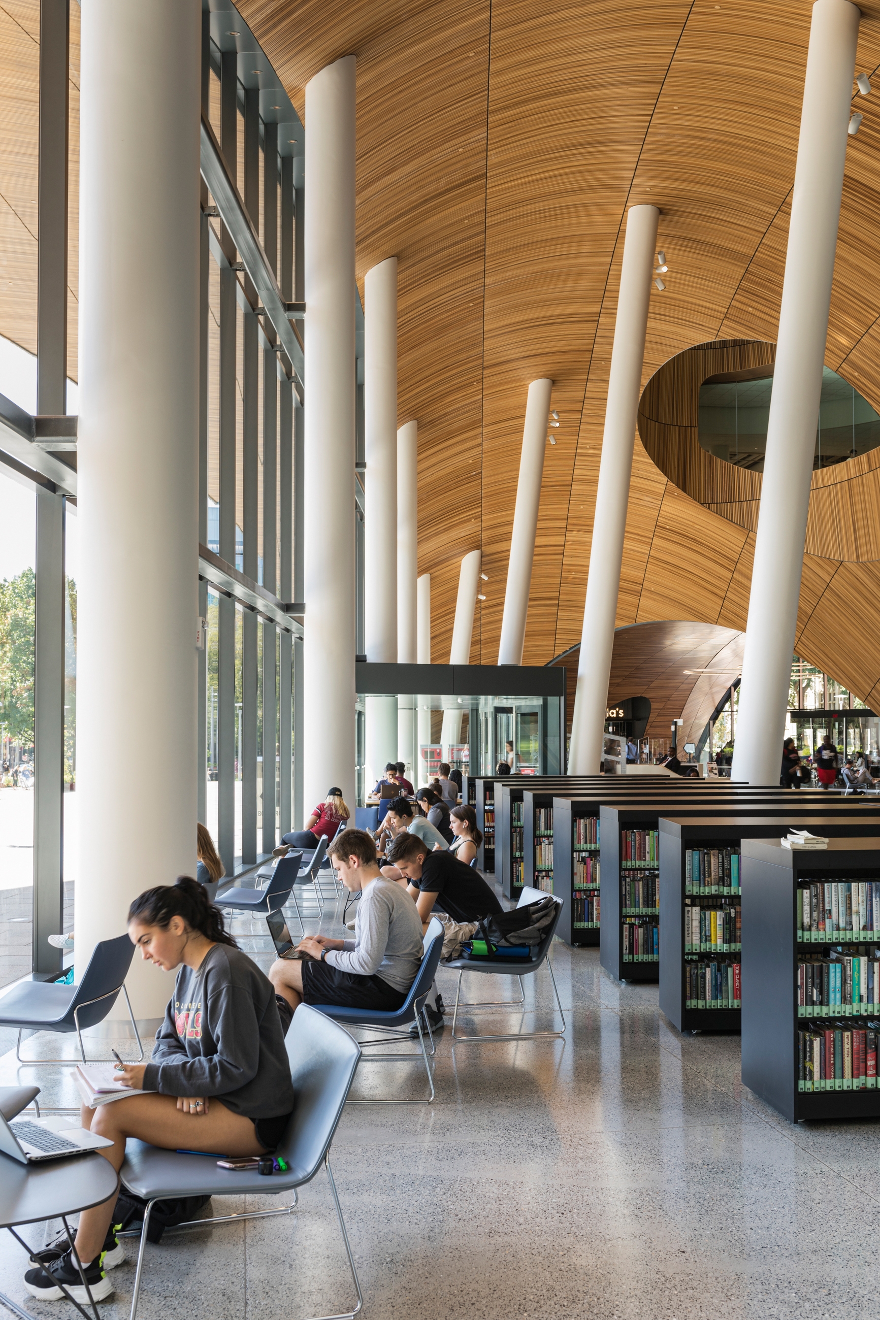 The landscape and site strategy capture this public-facing role, with generous plazas that slope up to the library entrances, not only inviting people in but also providing space for outdoor classrooms and informal gatherings. The building’s solid base is clad in vertical sections of split-faced granite, referencing the materials of the surrounding campus context. Grand wooden arched entrances cut into the stone volume and announce a welcoming point of entry. Expanses of glass create maximum transparency at the three major entrances.