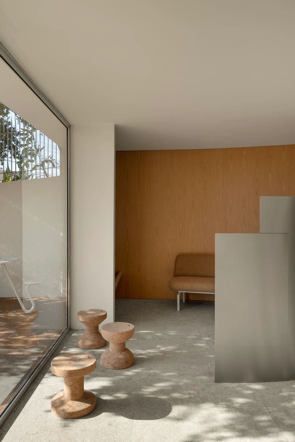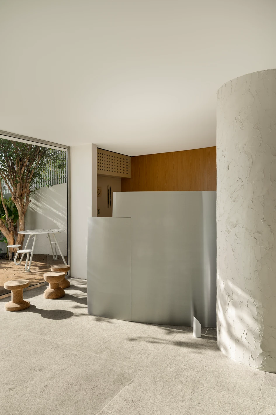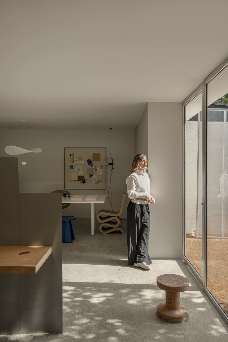 The moodboard panel, developed on site by the architect Mariane Rios during the construction, expresses the creative process. Made on an acoustic panel and finished with the same paint as the walls, it symbolizes a "blank panel" for new ideas, representing the essence and originality of the project.