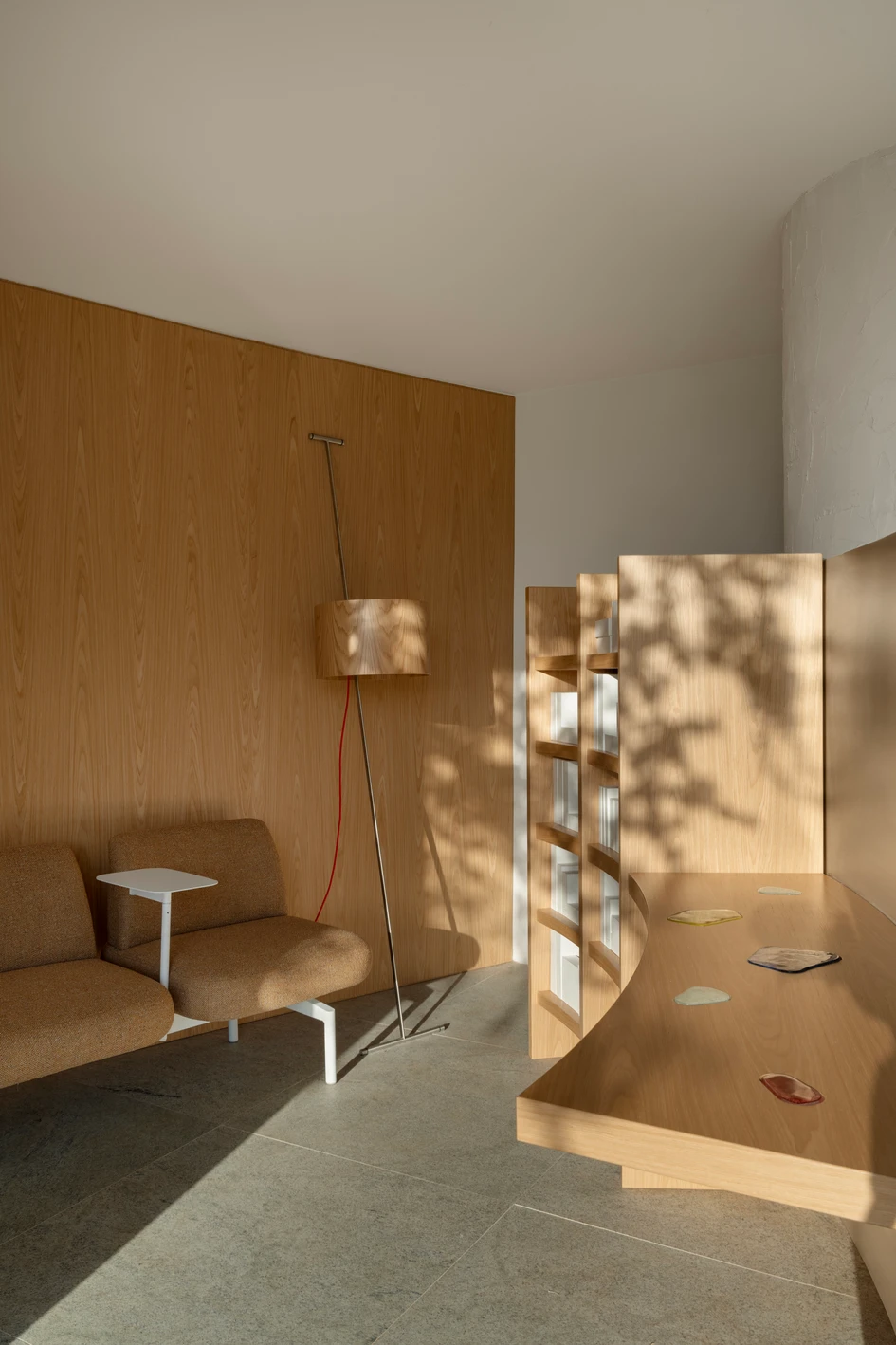 Starting from the column, an independent curved line tangles the pillar, and proposes through a partition a more reserved and comfortable space, for when it is necessary to work informally and intimately. Its stainless steel enclosure preserves the initial concept of a sinuous line, due to its thickness. Internally, the wood involves the movement, which unfolds from a bookcase to a cantilevered countertop, providing a sensory experience through the stained glass windows.