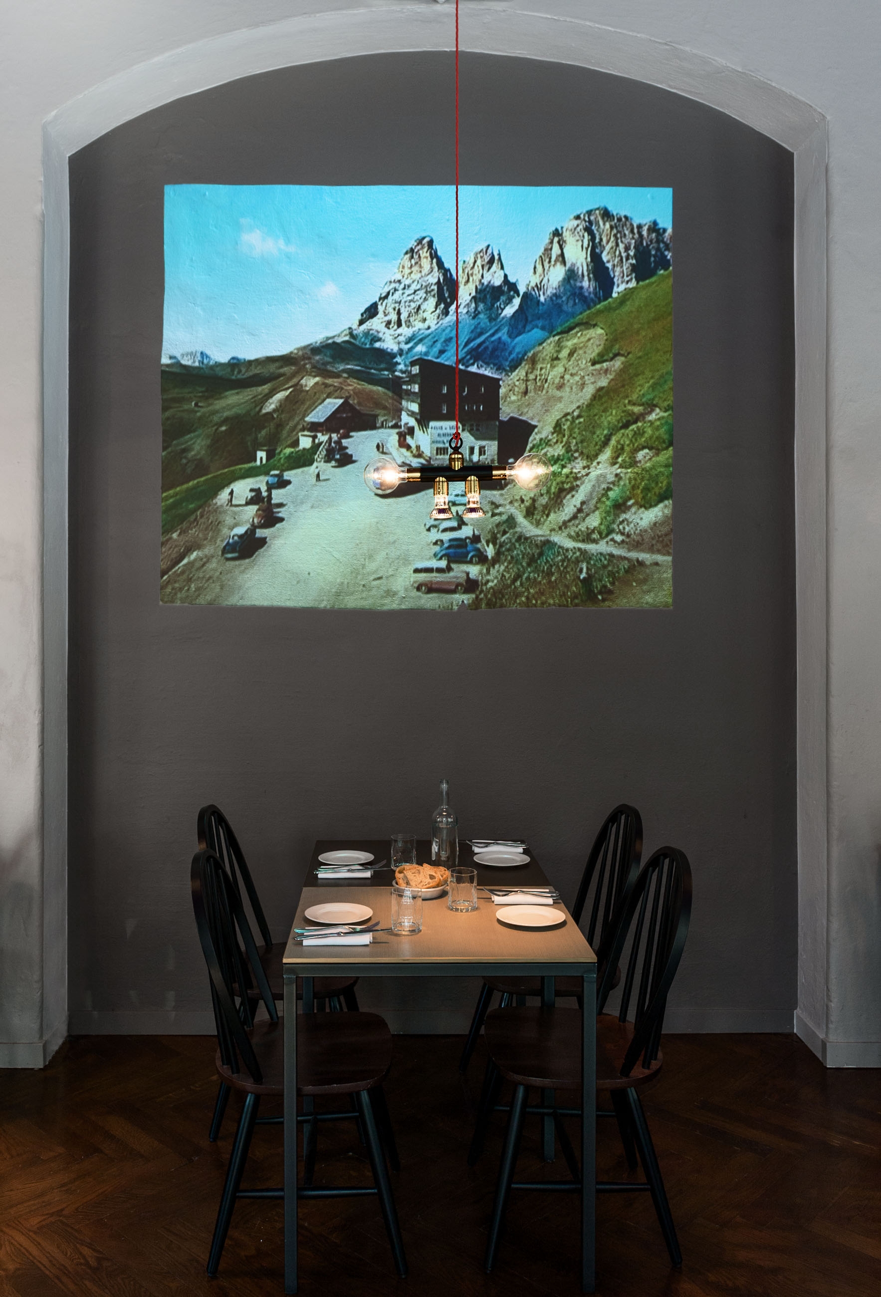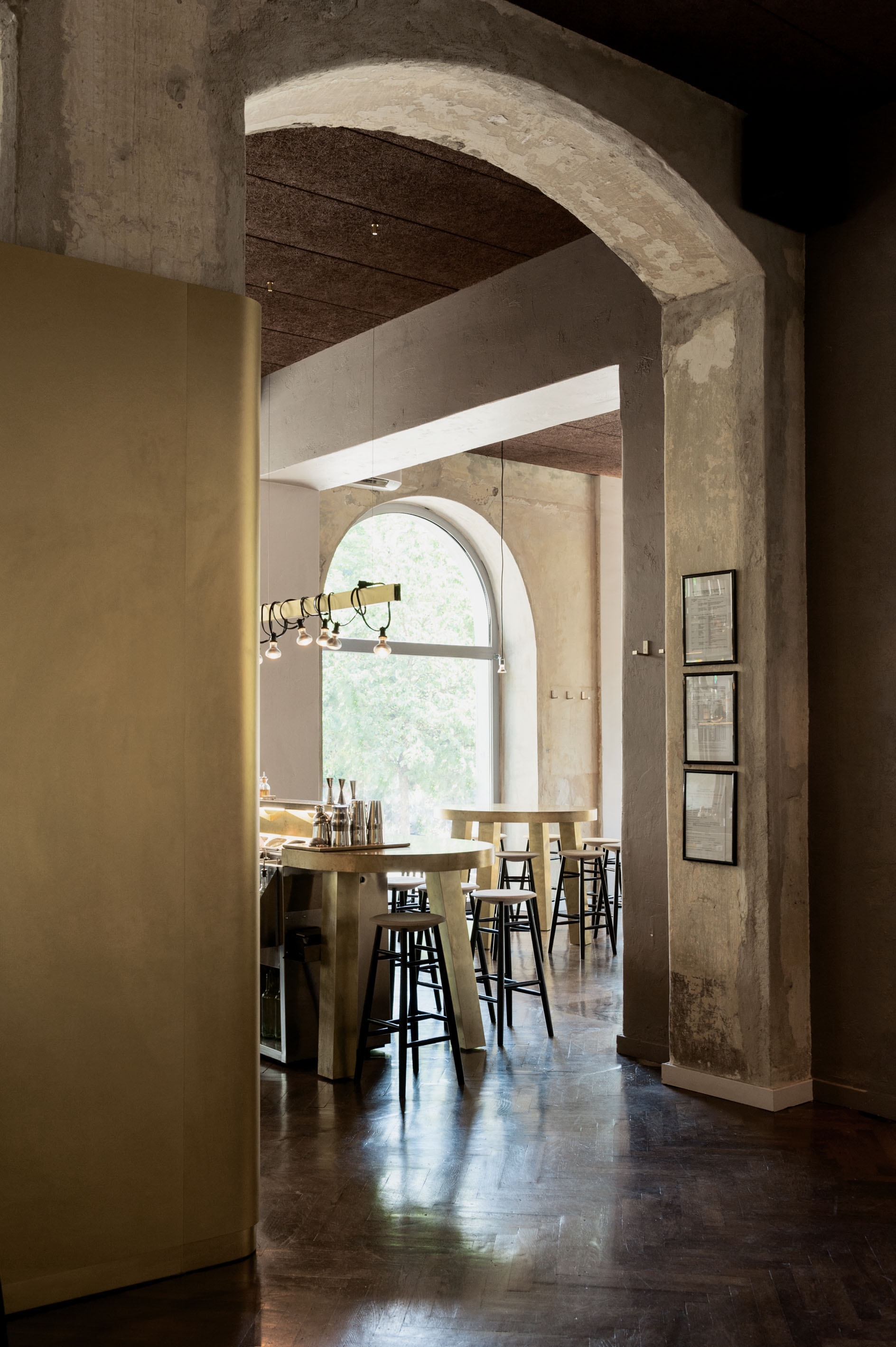 Il decor mixa elementi d’epoca con altri più moderni, per un layout contemporaneo. Il pavimento in legno si contrappone ai muri storici, lasciati in parte grezzi. Il disegno dei tavoli - infantili, o primari, nella loro semplicità - è un omaggio alla poetica di Aldo Cibic. I materiali sono lavorati in modo inconsueto, come per la ceramica da pavimenti utilizzata sulla superficie dei tavoli in 3 tonalità, con bordi in ottone ruvido.