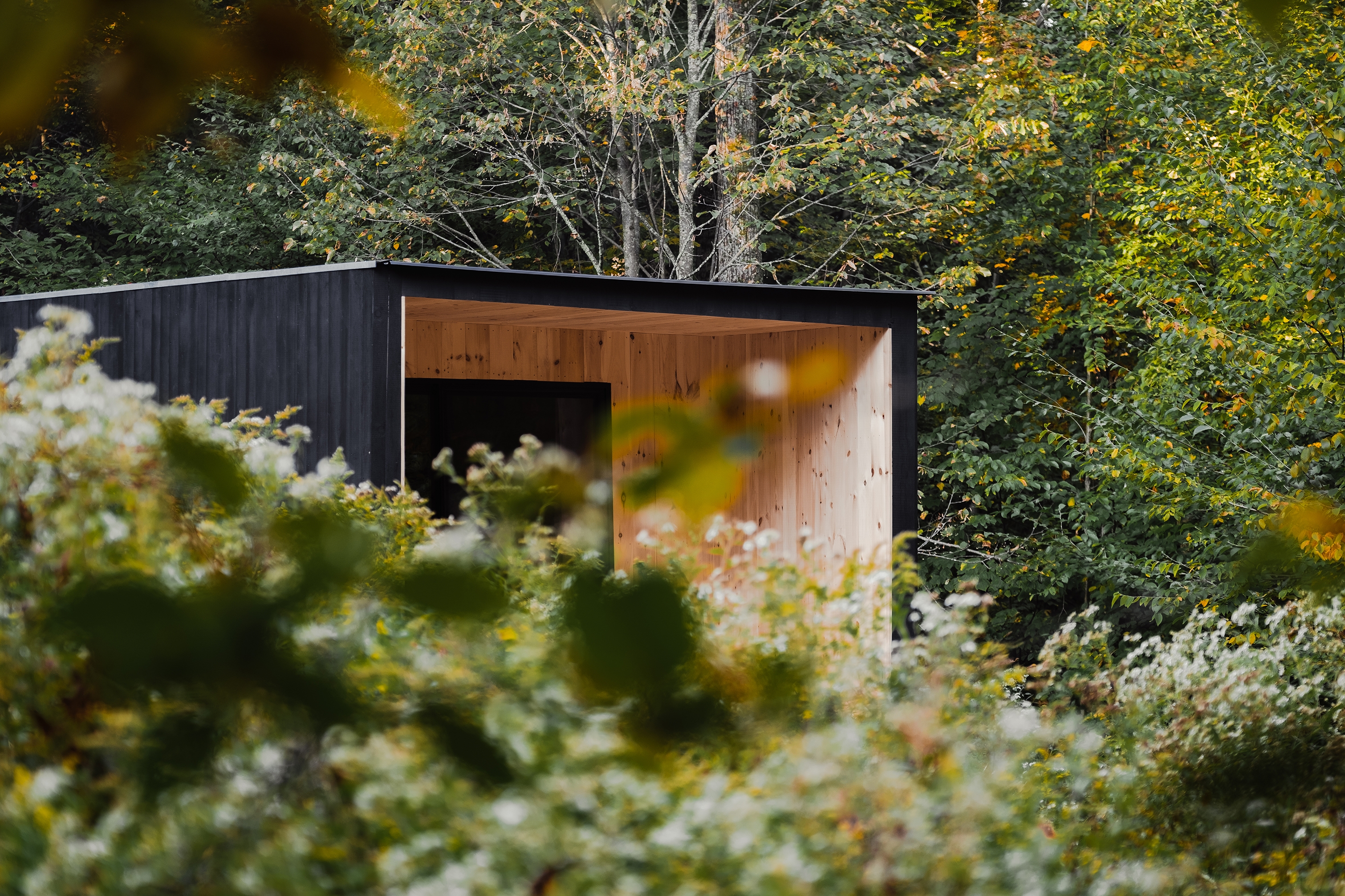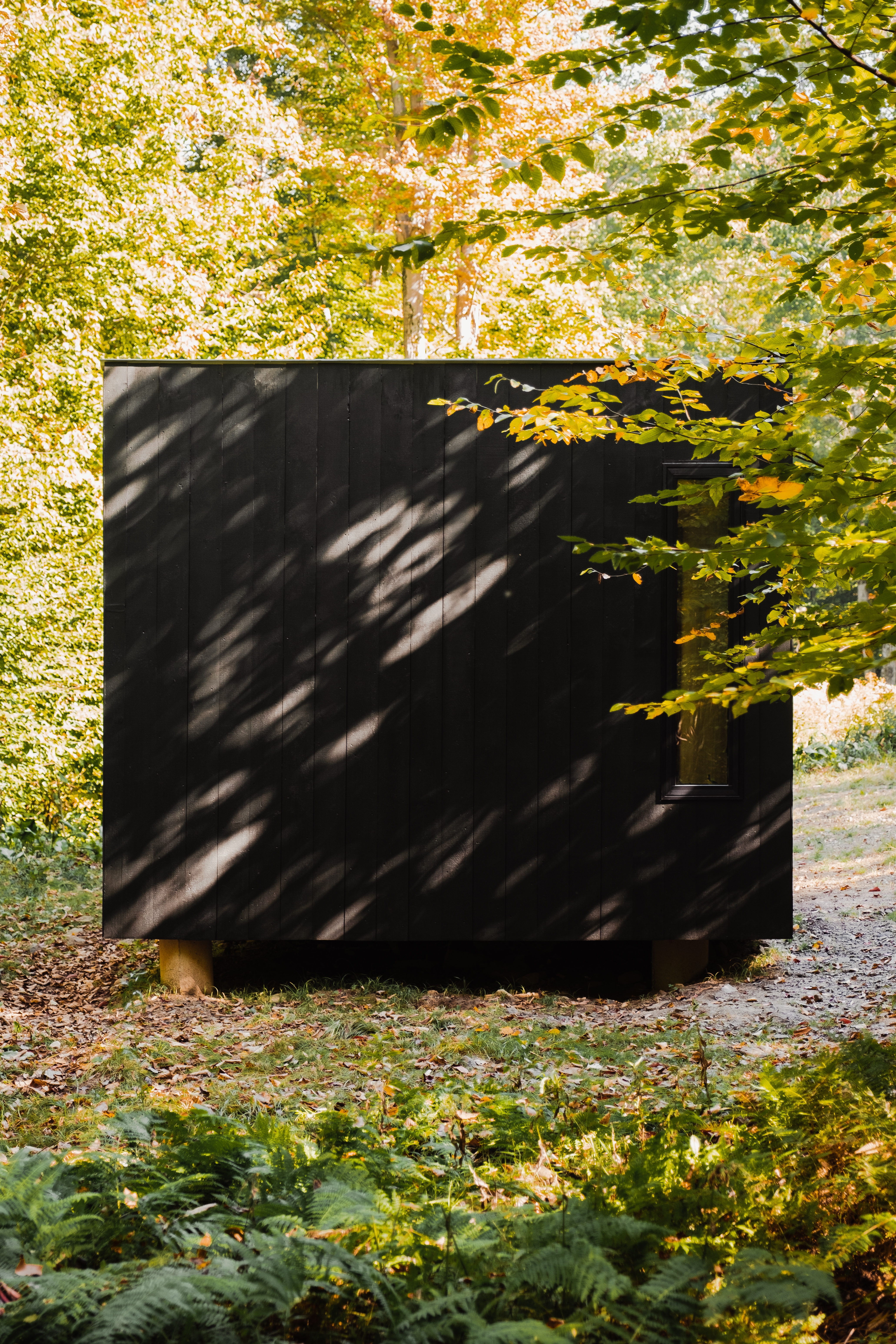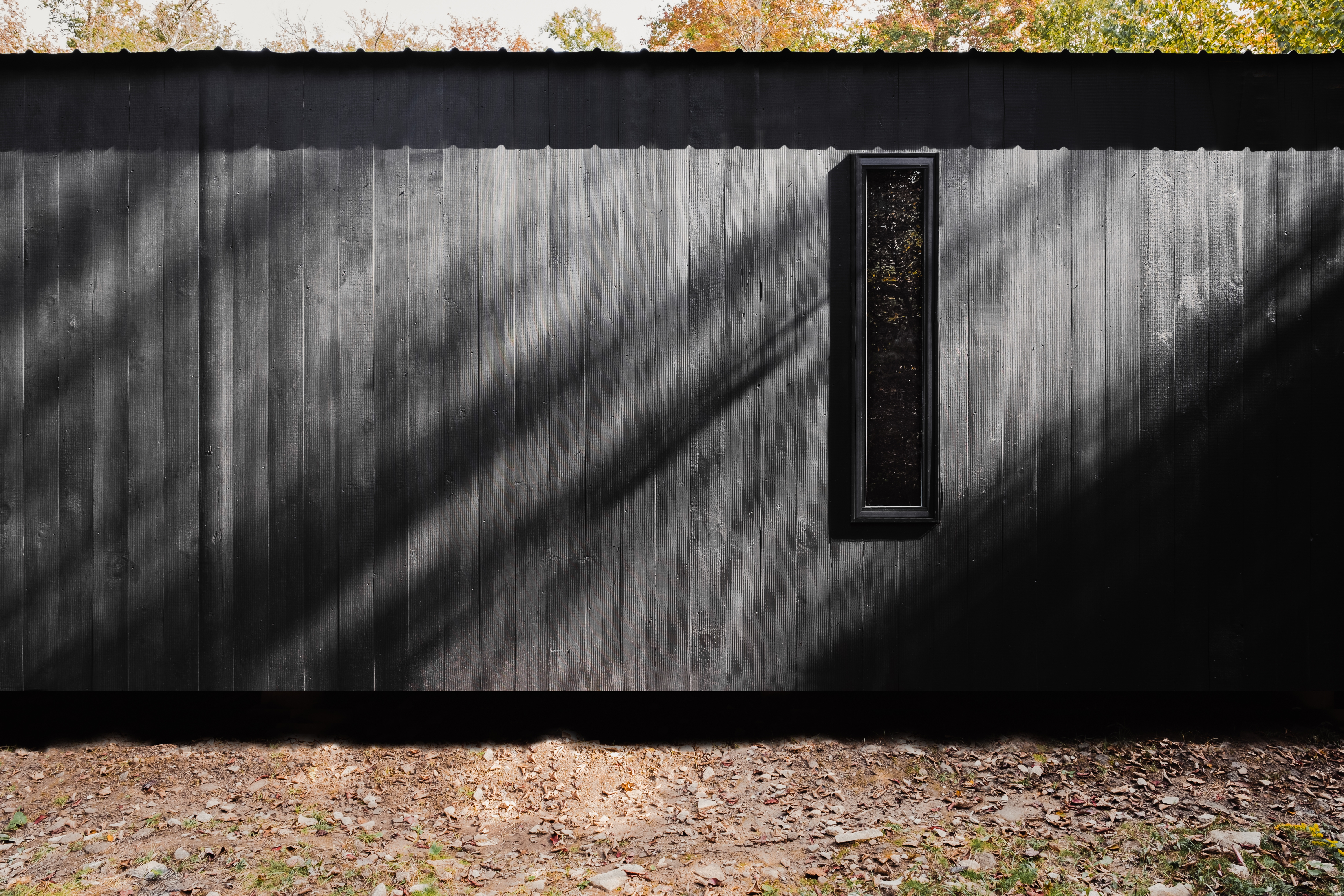 The presents of the structure highlights the surrounding environment itself. The building acts as an inflection point within the context of space to heighten our awareness of the environment. The east facing façade, austere, with no fenestration acts as a screen for the sun and trees to project a play of light and shadow. This interaction produces a type of camouflage for the structure, blurring the delineation of its edges and mass with the passing of ephemeral light. Psychologically, the interplay of light and shadow establishes a sense of place through memory. The building can only exist in this specific environment through the interaction of the trees, sunlight and our eyes.