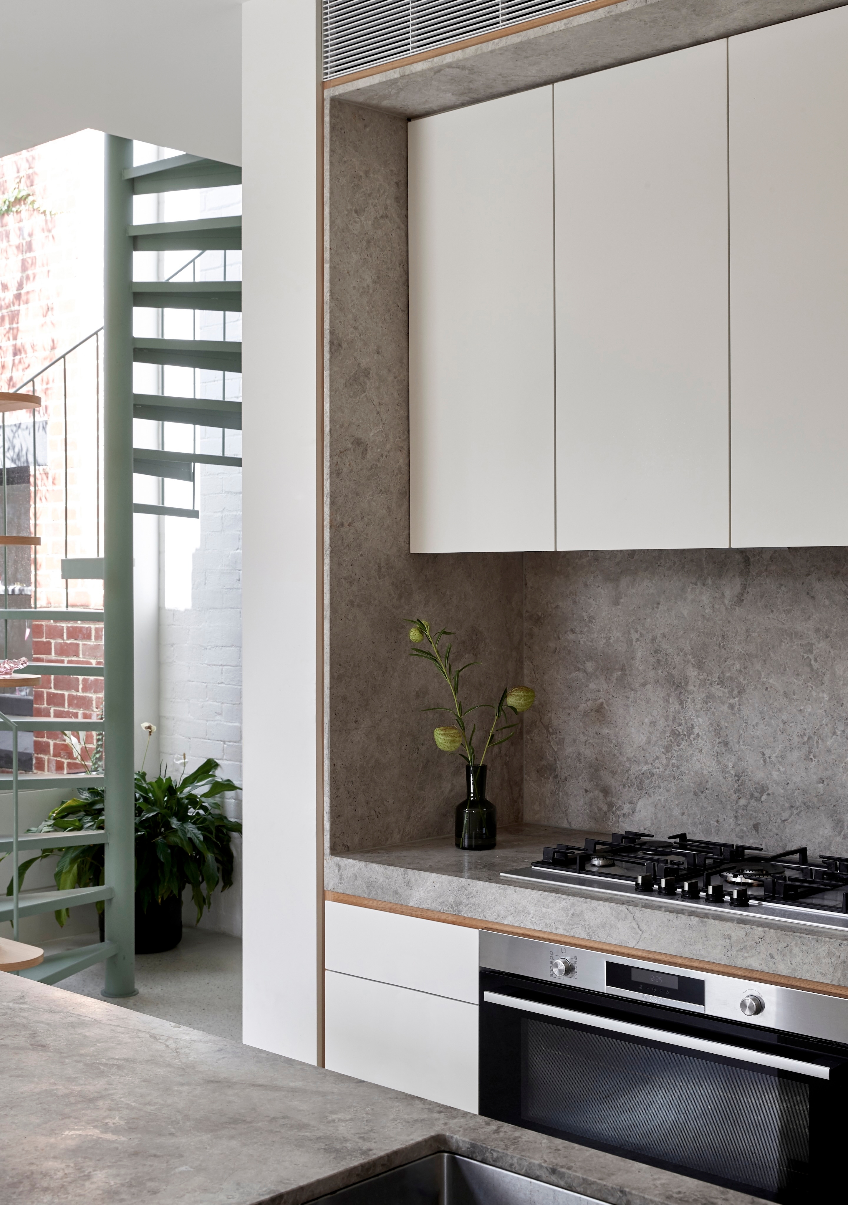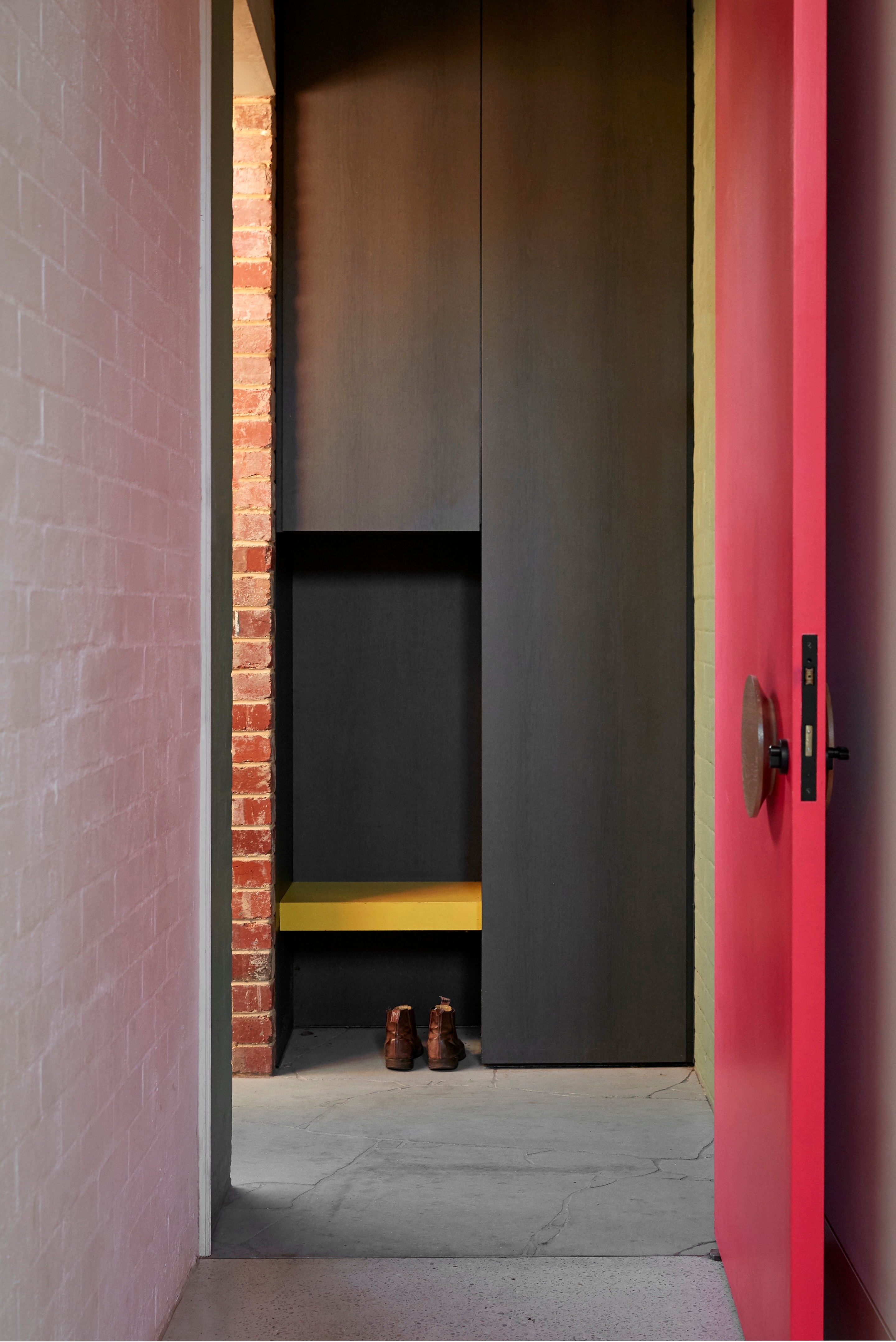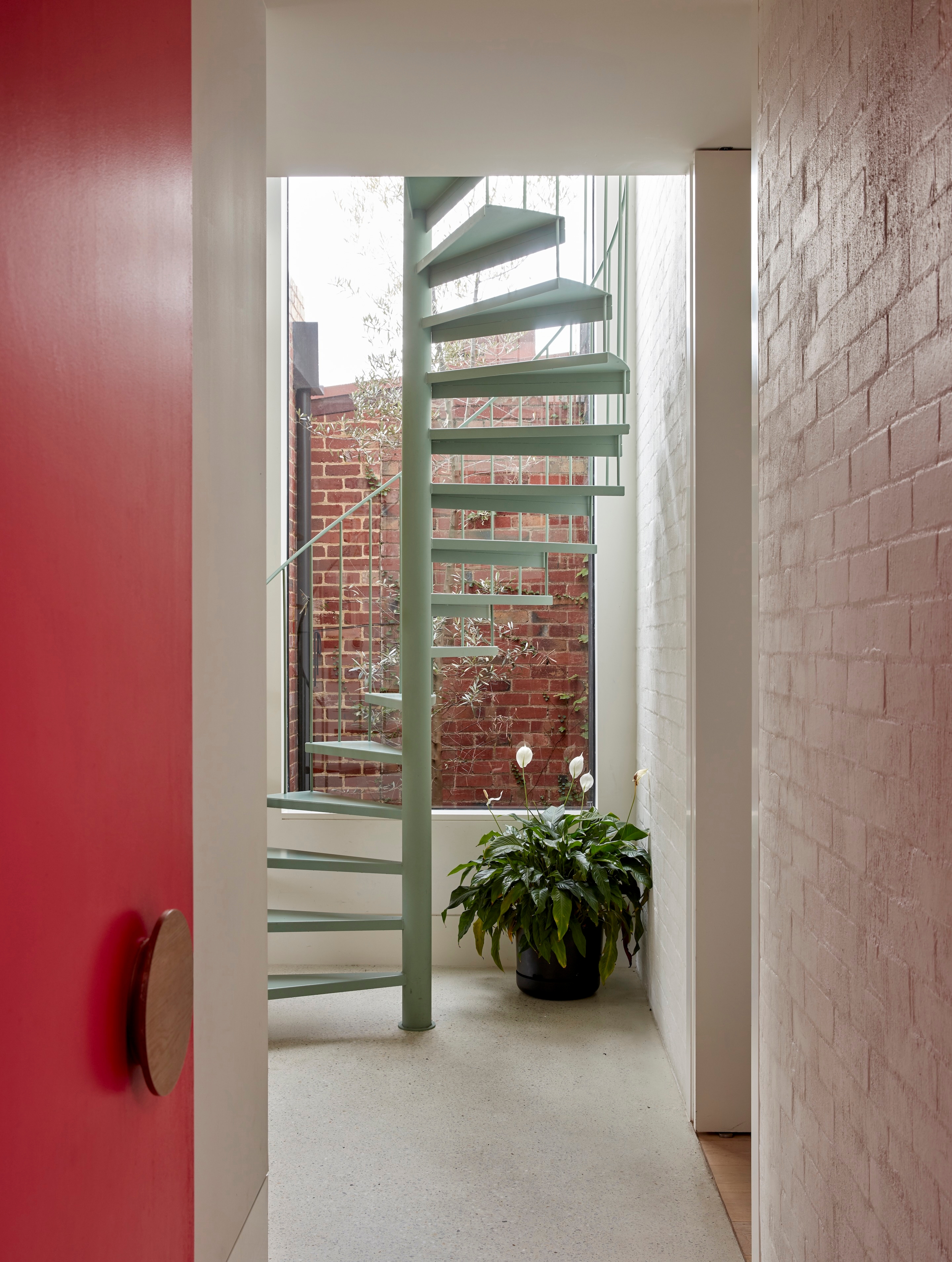 The entry is now relocated further into the home, accessed via a landscaped garden path along the side of the house. A bright pink door opens to the extension, where joinery keeps the entrance organized and the entry passage offers a view of the spiral staircase and light-filled courtyard beyond. The fluoro-pink spray paint and pops of other bright colors reflect the clients’ sense of playfulness and fun.