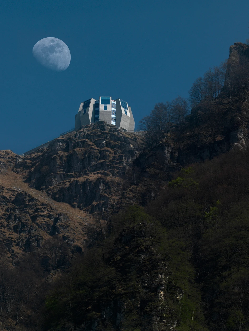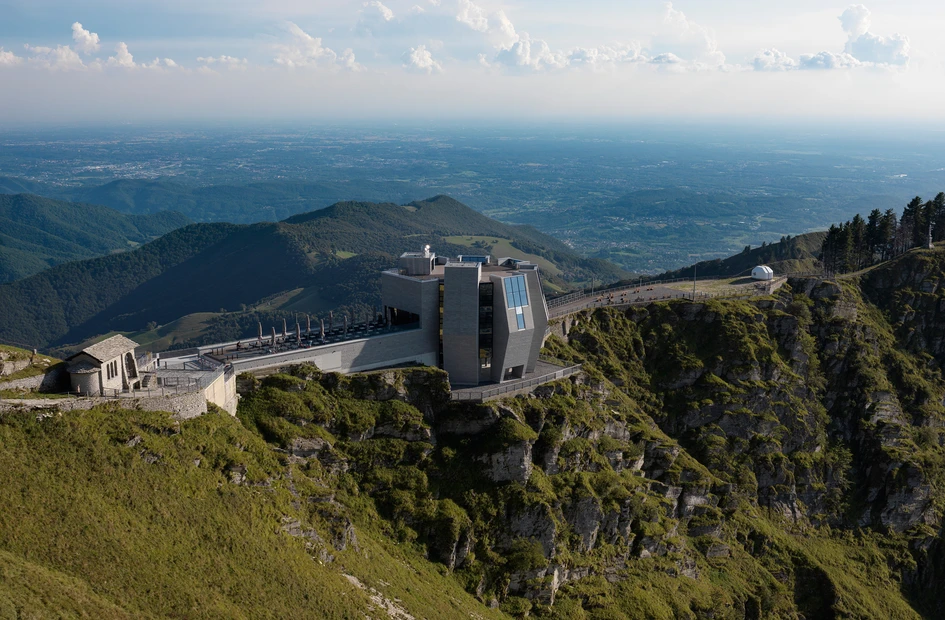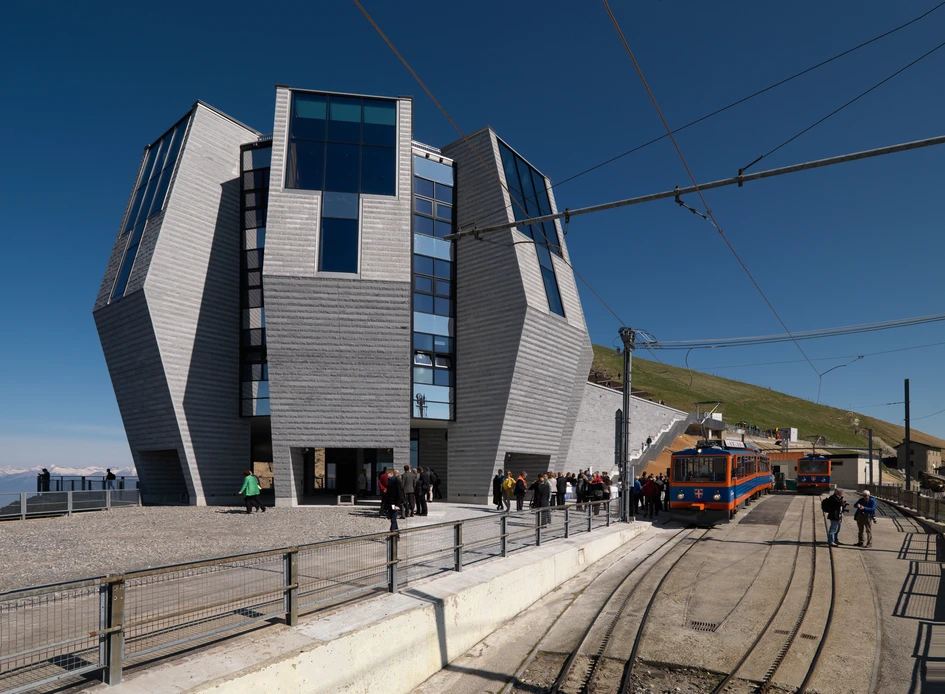The arrangement of the individual components (or “petals”) creates a group of five-storey towers that project out slightly, to close again on the upper floors. On the level of the rack railway station (ground level), a spacious entrance area with an entryway connects the exterior with the interior. The exhibition room, which can be accessed via the entryway, is home to information boards with the history of Monte Generoso and a model of the current building with plans and sketches drawn by architect Mario Botta.