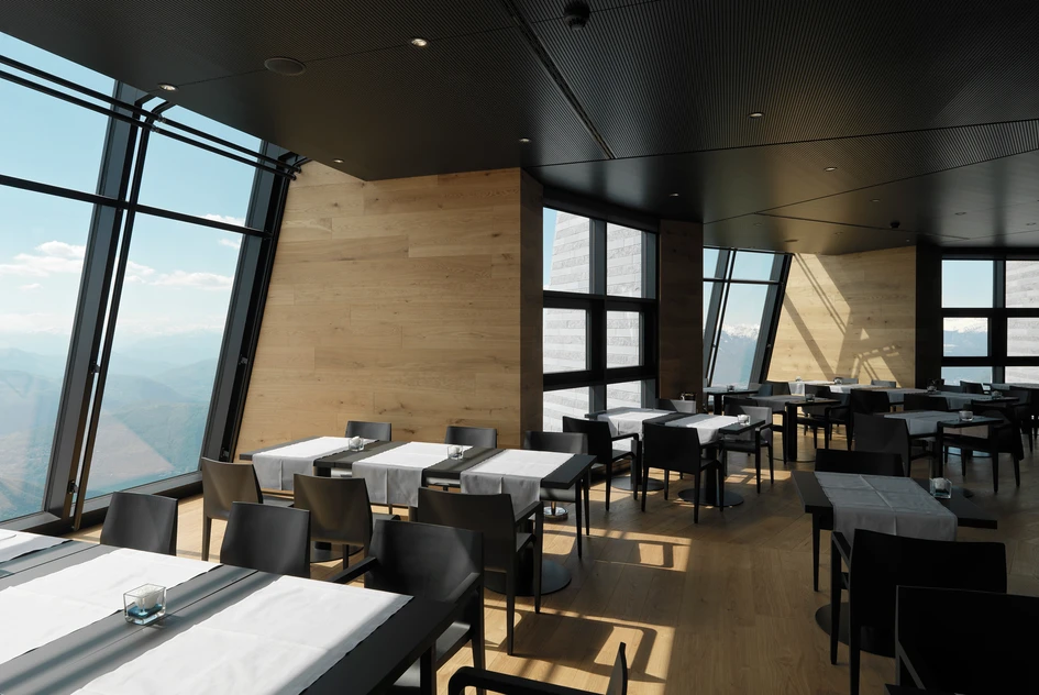 The service rooms are located on the first floor, a conference room that seats up to approximately ninety people is on the second floor, and the upper two floors contain a selfservice restaurant (with access to the large terrace) and a refined upscale restaurant. The bearing structure is in reinforced concrete clad in grey natural stone with alternate smooth and split bands. The seemingly self-contained towers are interconnected by large glazed surfaces that afford 360° panoramic views – of the Po Valley around Milan to the south and Lake Lugano and the Alps to the north. The result is a powerful, distinctive, geometrical building in contrast, and therefore in dialogue, with the natural features of the surrounding landscape.