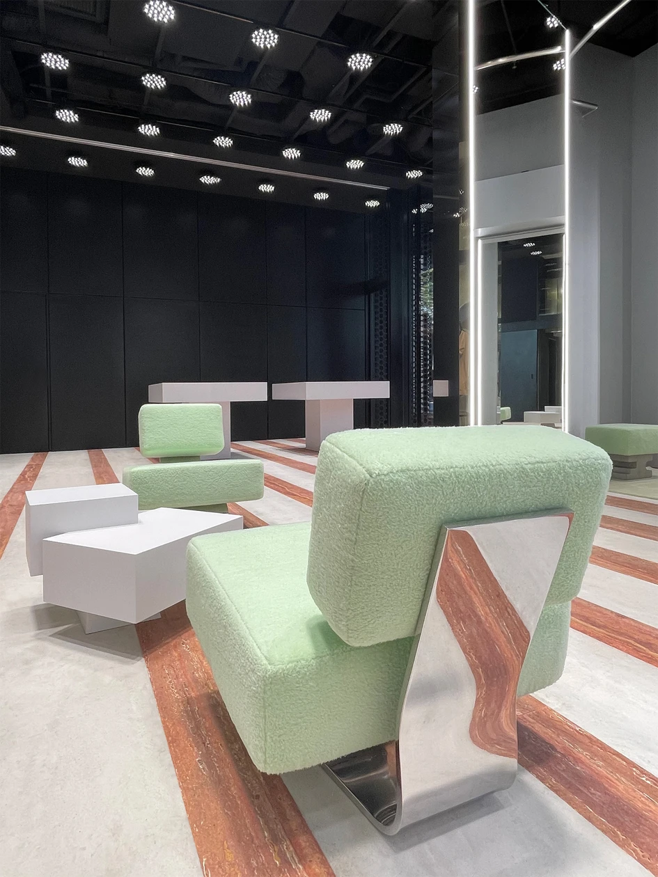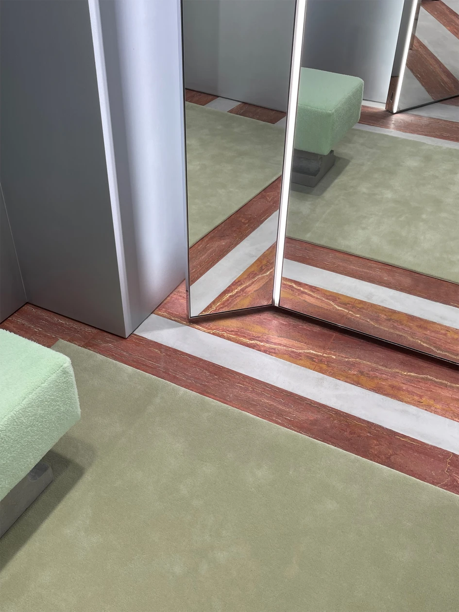 I pavimenti in Travertino Rosso Margraf richiamano l’italianità del brand e l’architettura monumentale; questo materiale naturale viene accuratamente posato in abbinamento al cemento e alla moquette, in un’alternanza di motivi geometrici e forme organiche, che creano superfici ricche di contrasti, calde e accoglienti.