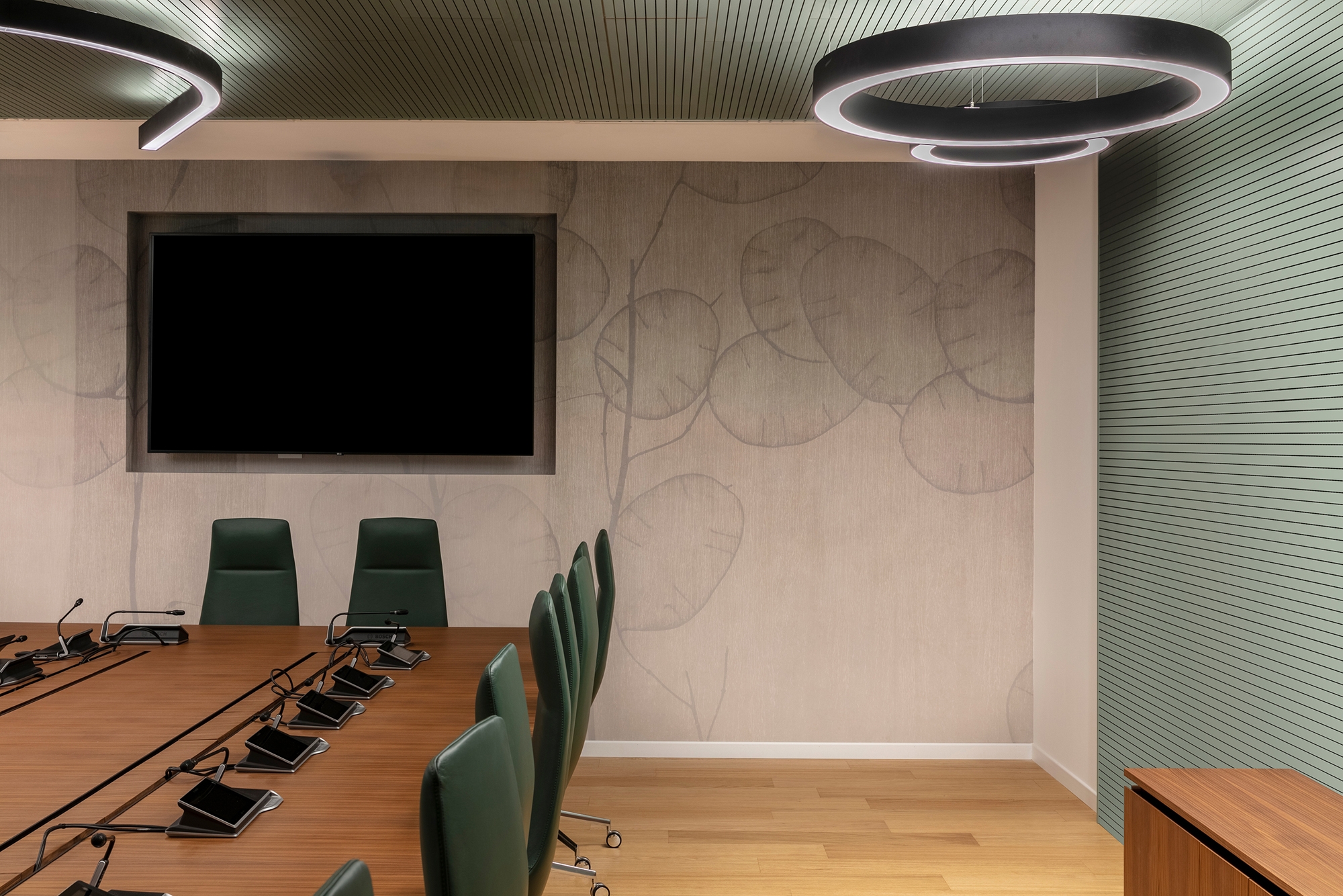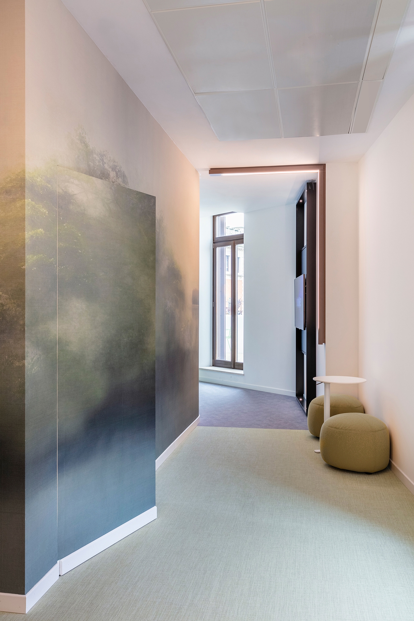 Negli uffici open space, definiti in parte da pareti in cristallo a favore della massima osmosi visiva, so-no stati utilizzati i soggetti Mangrove, Pure e You nelle tonalità calde della terra (beige e marroni), che richiamano il travertino e il cotto, colori tipici della “città eterna”. Nelle zone break e di passaggio ab-biamo invece scelto Matinée nei toni sfumati del grigio e del verde per sottolineare l’importanza data dall’azienda alla sostenibilità. Coordinati ai wallcovering sono anche gli arredi e gli apparecchi illumi-nanti. Nella sala riunione l’essenza del legno del grande tavolo centrale si sposa in modo naturale con il verde delle poltroncine imbottite e le sfumature degli scenari a parete Mangrove.