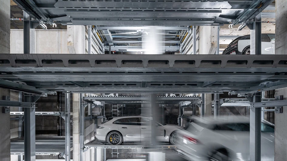 The Franklinturm also fulfils important public space functions. In addition to the ramp to the public bicycle garage, deliveries to and from the station's ShopVille also take place on the ground floor of the tower. The adjacent ‘WÖHR Multiparker 740’ parking system efficiently integrates 38 car parking spaces for the tenants in the building. Once the vehicles have been parked in the transfer cabin, they are automatically removed within approx. 139 to 222 seconds and parked in the four-storey high-bay warehouse in the basement. Depending on the vehicle height, 21 parking spaces up to max. 2.00 m and 17 parking spaces up to 1.70 m are available for vehicle weights up to max. 3.00 tonnes. The 360° swivelling device in the transfer cabin enables convenient parking and unparking in the direction of travel.