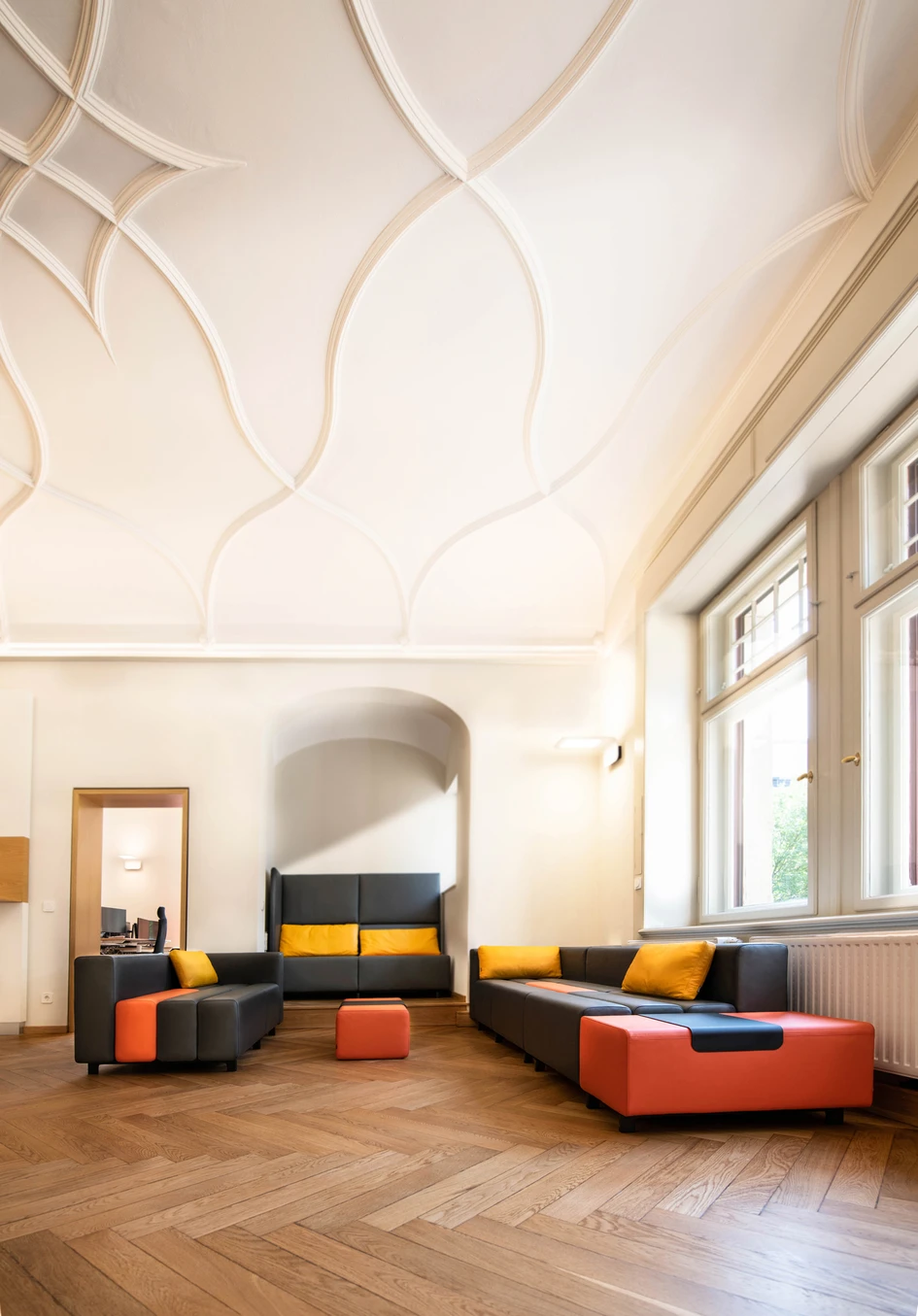As part of the rehabilitation work the Dresden interior planning office ehrlich+richters was commissioned with devising the concept for FSD's interiors. The creative interior designers began by immersing themselves in FSD's work, which is highly technical in nature on the one hand yet also visionary and future-oriented on the other. For the multi-purpose consulting rooms ehrlich+richters selected the innovative modul21 furniture system. The modular and highly adaptable seating accords perfectly not only with FSD's self-concept but also with the character of the work performed in the rooms, with the 20 cm segments on which the furniture system is based enabling a perfect fit in the various functional areas. Thanks also to the high-quality materials and use of the modul21 elements for colour accentuation, a timelessly modern ambience has come about in the stylish, historic interiors, lending the rooms a unique look of their own.