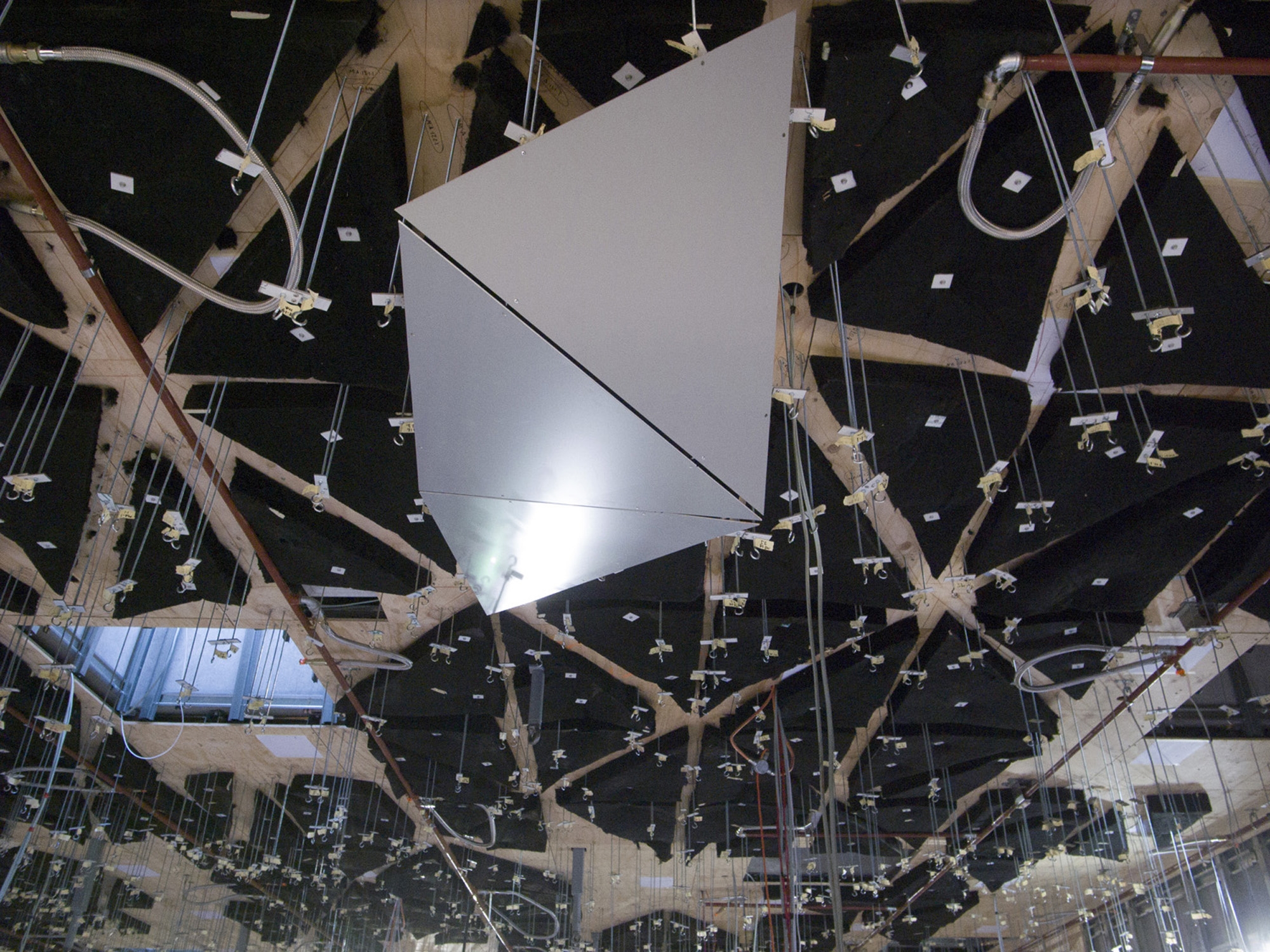 Suitably perhaps, the UTS Great Hall was AR-MA’s first project, as a young practice of four. AR-MA worked with DRAW and Facade Innovations on the undulating, triangulated mantle, the signature element of the project. Comprising more than 1000 perforated aluminium facets, the mantle lines the ceiling and walls, integrating lighting, audio-visual, fire, and mechanical services into a dynamic whole, breathing life into the most important ceremonial space on campus.