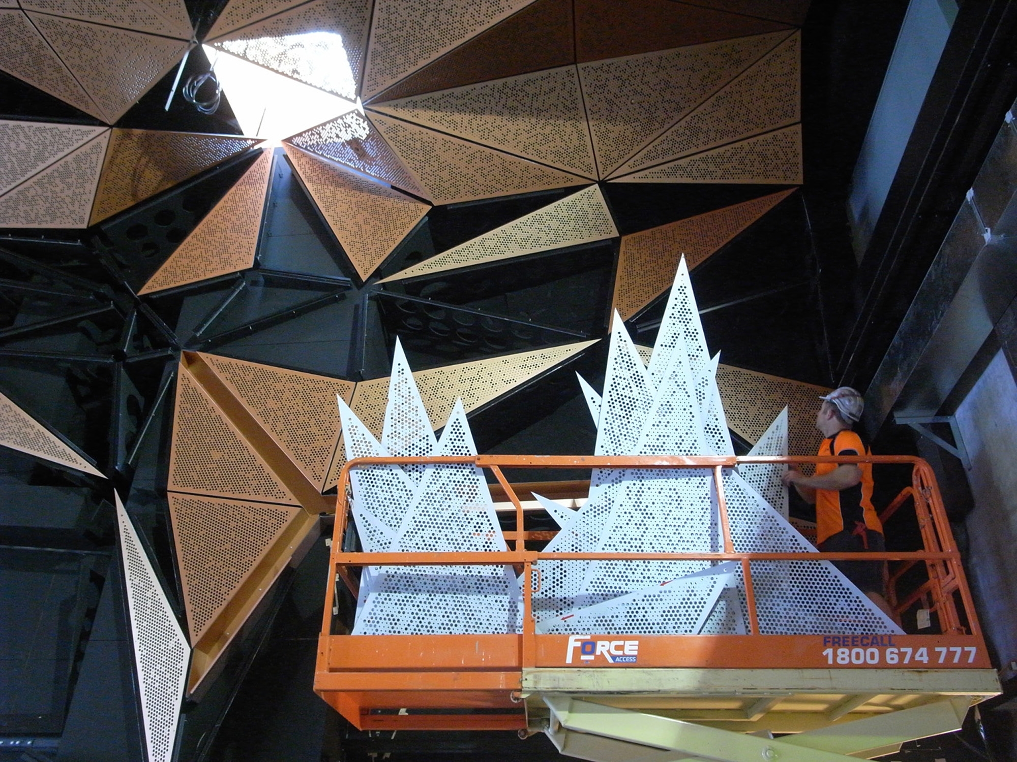 AR-MA worked with Facade Innovations during this window to develop a construction system to realise the complex geometry of the mantle and the logistical complications involved with tracking large quantities of unique elements. To aid in this process, AR-MA incorporated installation and assembly instructions for sub-structure steel and façade aluminium panels on a plywood datum plane positioned against the slab above, a process they have used many times since. AR-MA also worked with DRAW to detail the perforation system for the aluminium composite panels. Working inside acoustic and aesthetic constraints, AR-MA algorithmically placed 1.2 million perforations of differing sizes throughout the 1010 facade panels.