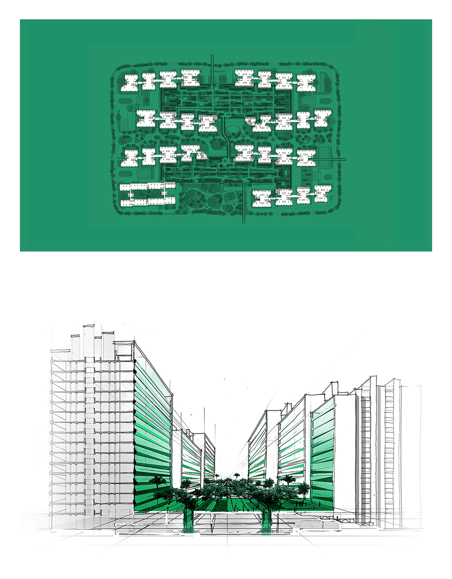 One of the key features of the design is the Greenery network and social spaces linking the upper Environmental Deck and the Green Canyon area at ground level.