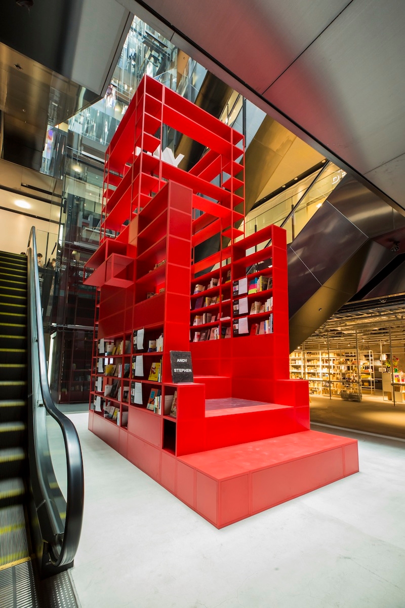 The space consists of what we call "interfaces" or movable furniture systems instigating people's activities. These "interfaces" are something between architecture and furniture: they are furniture systems which can be moved only by store administrators who know the mechanism of each system. One of the "interfaces" is a wall system composed of raceways perforated at every 1200mm along the entire length, installed at 1200-mm intervals at the height of 2750mm above floor level.