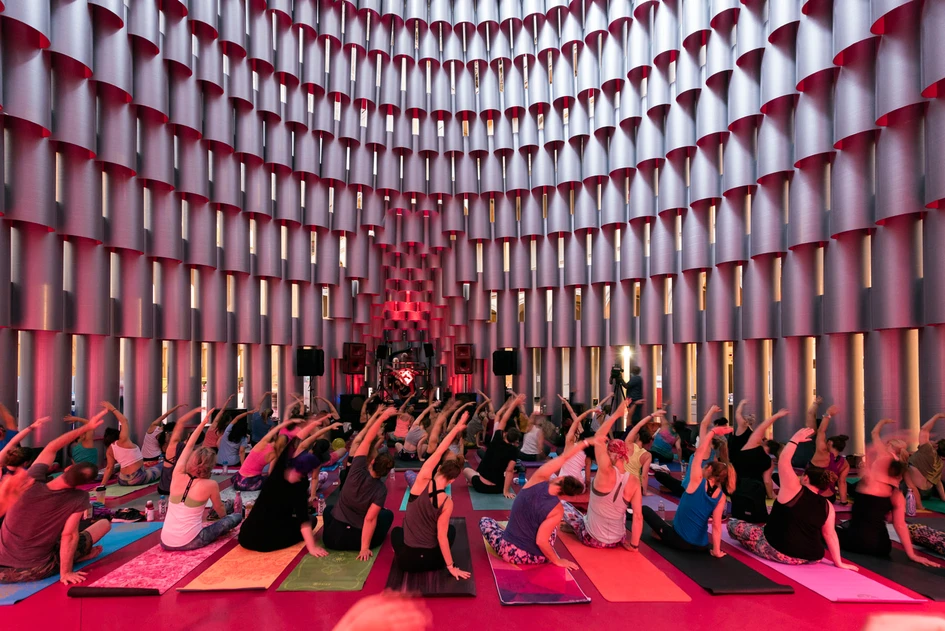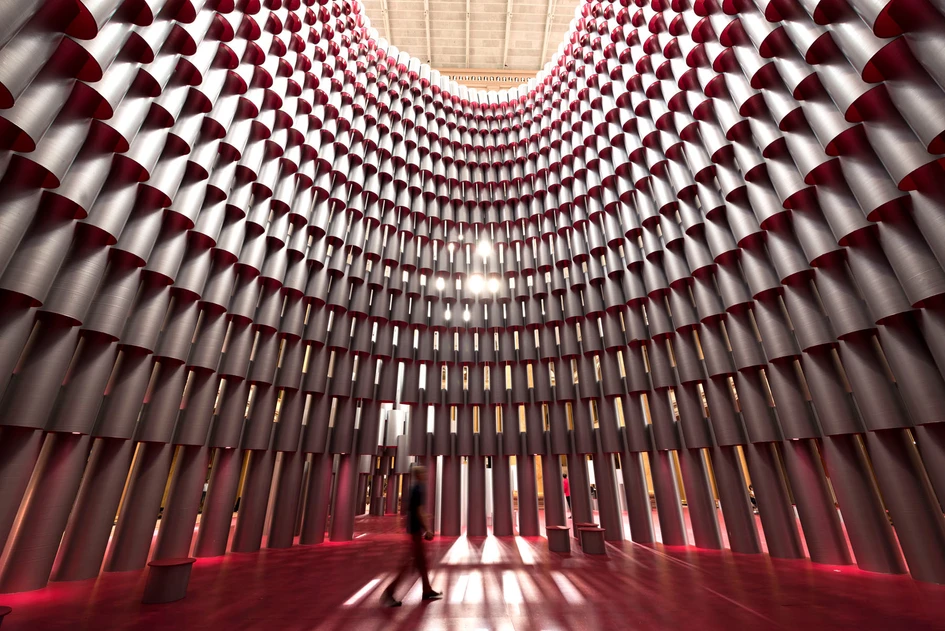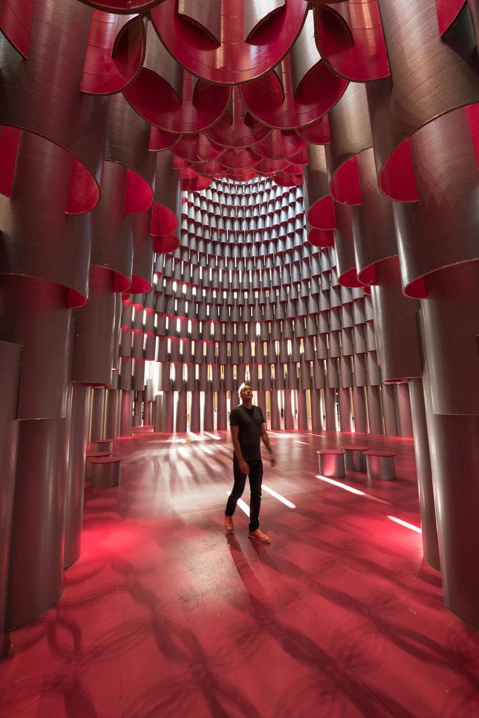 “When you enter the Great Hall you almost feel like you’re in an outside space because of the distance sound travels before it is reflected back and made audible,” said Studio Gang founding principal Jeanne Gang. “We’ve designed a series of chambers shaped by sound that are ideally suited for intimate conversations and gatherings as well as performances and acoustic experimentation. Using wound paper tubes, a common building material with unique sonic properties, and interlocking them to form a catenary dome, we create a hive for these activities, bringing people together to explore and engage the senses.”