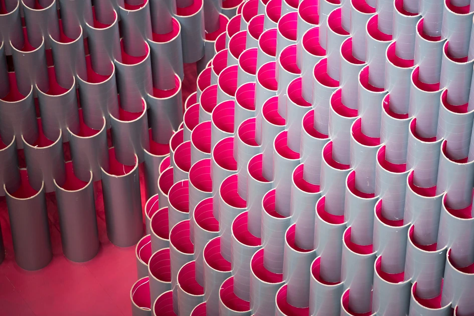 The tubes vary in size from several inches to 10 feet high and will be interlocked to create three dynamic interconnected, domed chambers. Reaching 60 feet tall, the installation’s tallest dome will feature an oculus over 10 feet in diameter. The tubes feature a reflective silver exterior and vivid magenta interior, creating a spectacular visual contrast with the Museum’s historic nineteenth-century interior and colossal Corinthian columns.