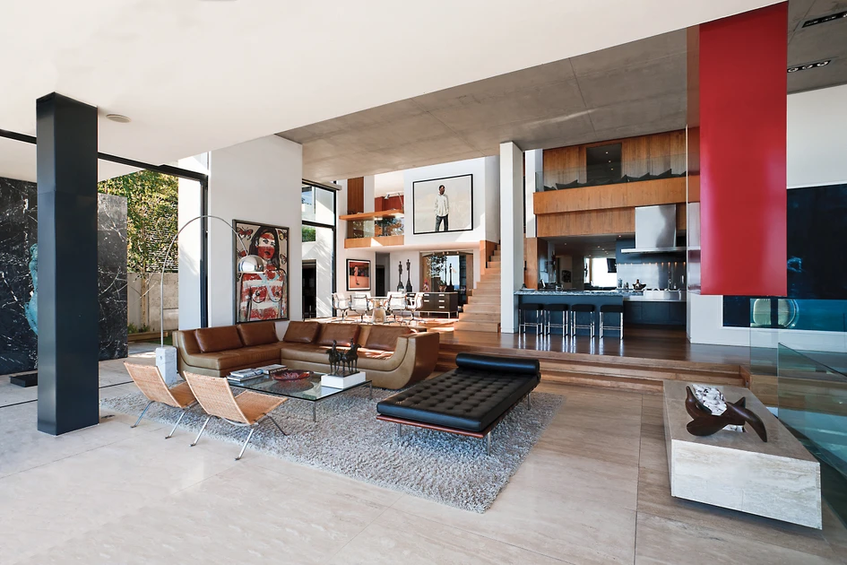 The interior finishes are rich and varied, including timber cladding, and richly coloured mosaic accents. Textured stone cladding adorns the internal and external walls and is contrasted against the roughness of the off-shutter concrete soffit in the living room, dining room and kitchen. The finishes are rich and varied in numerous areas in the house, including timber cladding, and richly coloured mosaic finishes.
