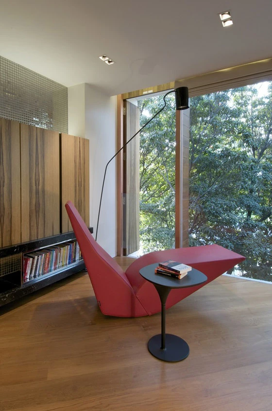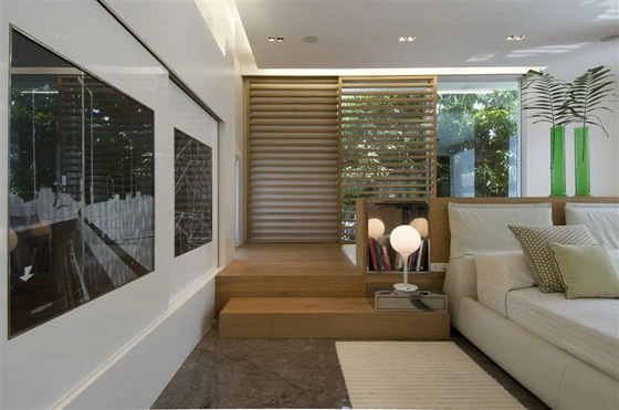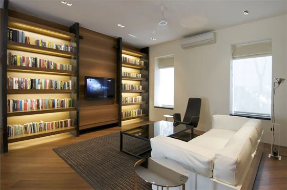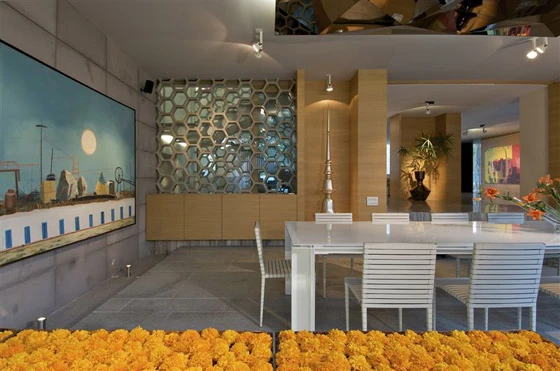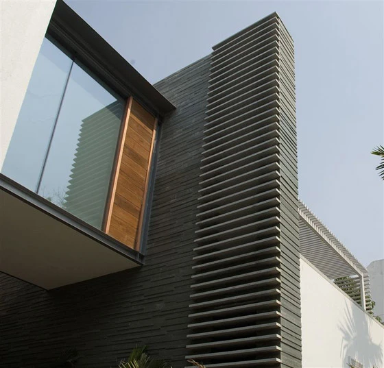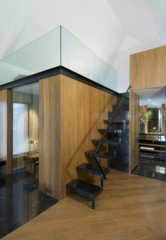 Additional rooms got cantilevered over existing structure ( for example the copper clad gym overlooking the front garden is a newly added cantilevered steel structure,as are the guest rooms and the steel and glass study attached to the master suite ) , redundant spaces got axed / demolished, new spaces were created wherever possible ( the new dining room was created by enclosing a part of the rear garden ) ,the grand spiral marble staircase fell a victim to the reorganizing,replaced instead by a sleek metal and stone one, in a different part of the house. The 10' diameter hole left in the sloping slab as a result of this got transformed into a skylight, and the roof got sheathed in a layer of black slate !