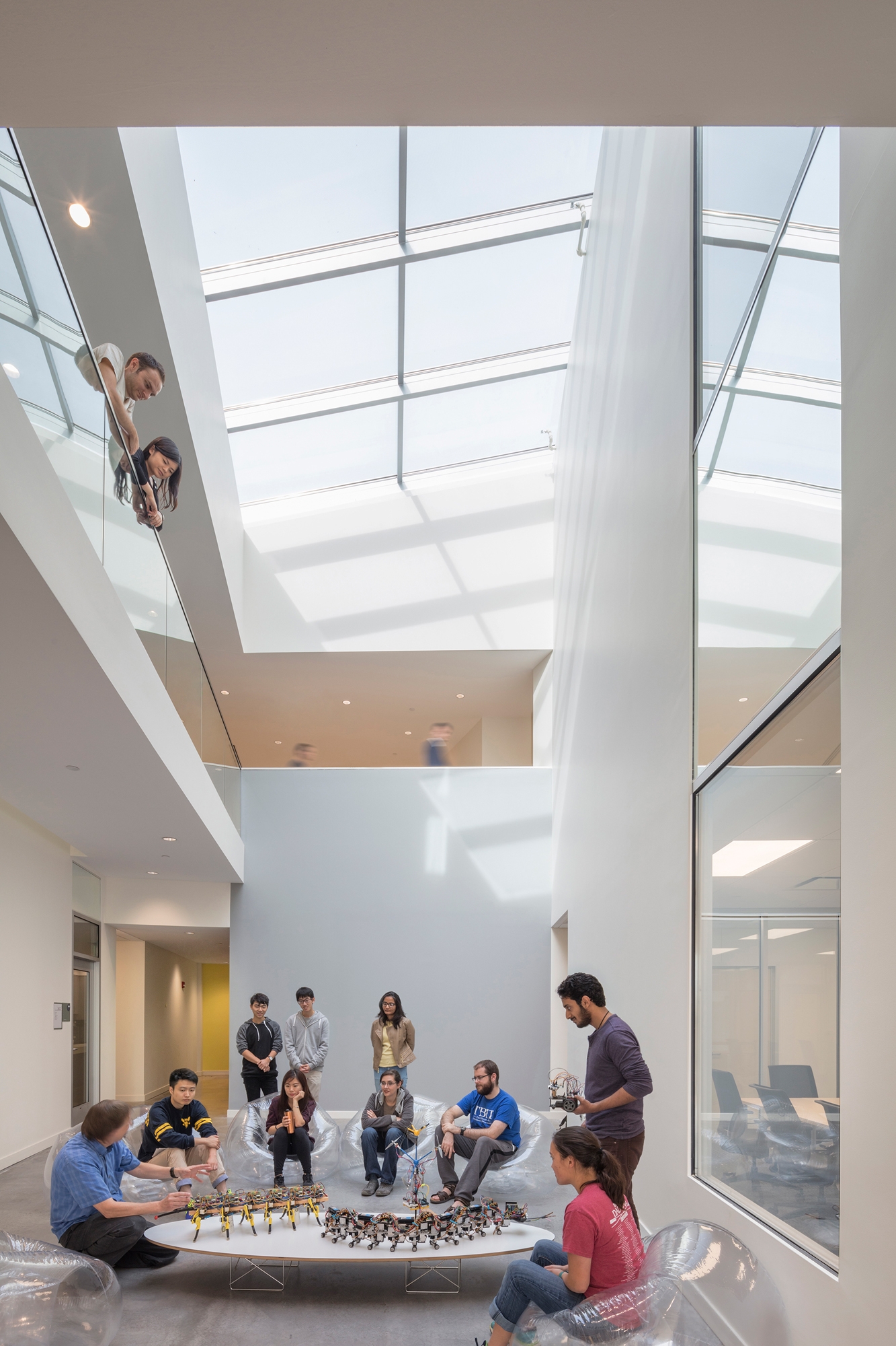 In the interior, social collaboration spaces are integrated into a generous public circulation sequence, which follows the building perimeter and engages each floor level with doubleheight collaboration zones with views to the Genesee River and the Science & Engineering Quad. The sequence of collaboration space culminates at a double-height, shared lab space with skylights that overlook the Quad and is linked by a new bridge to neighboring Hopeman Hall. Lab spaces are designed adjacent to collaboration spaces, using a modular bay system which supports flexibility and interdisciplinary research projects. All interior lab corridors terminate with window overlooks which admit natural light deep into the building interior. The public circulation sequence is expressed on the exterior facades, with large vertical glazed bays that “breakthrough” the brick envelope to reflect double-height collaboration zones, and shared overlooks that admit natural light deep into the building interior. A double-height curtainwall on the first and second level interlocks with the figure of hung brick on the upper floors and expresses the Institute’s mission to create an open and collaborative research culture that engages the green space of the renewed Science & Engineering Quad.