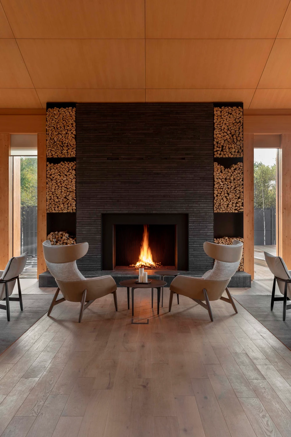 Gli interni, invece, sono stati curati da Martins Hermansons, designer capo di FortyFour Studio. L’architettura delle abitazioni riflette un profondo rispetto per gli elementi naturali. Ogni residenza si sviluppa su due livelli e presenta ampie vetrate e terrazze che sfumano i confini tra interno ed esterno. Le abitazioni sono realizzate con materiali ecologici, come legno e mattoni termoceramici, che garantiscono sostenibilità e al contempo una sensazione tattile calda e accogliente. La luce naturale gioca un ruolo fondamentale nel progetto, con grandi finestre posizionate strategicamente per massimizzare l’illuminazione e incorniciare le viste sul paesaggio circostante.