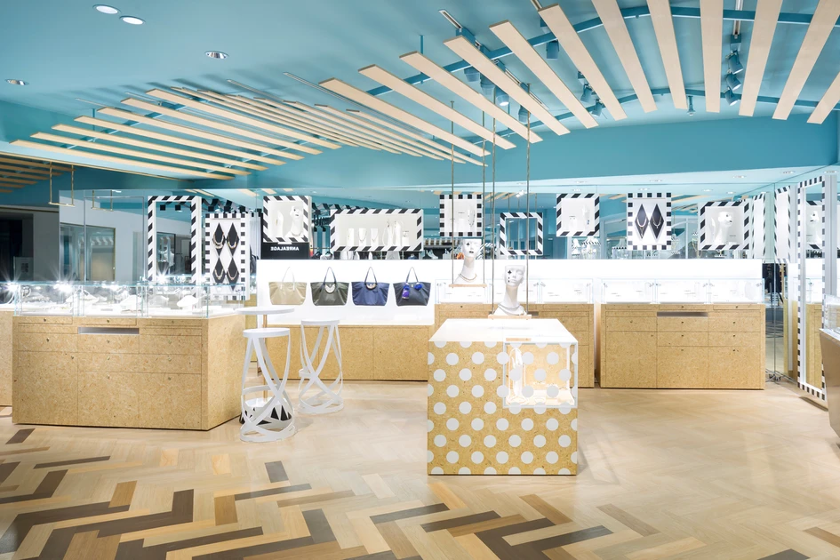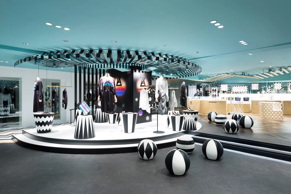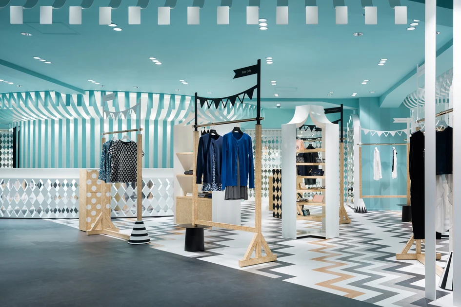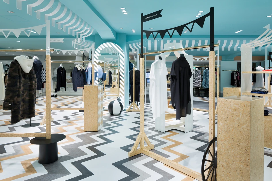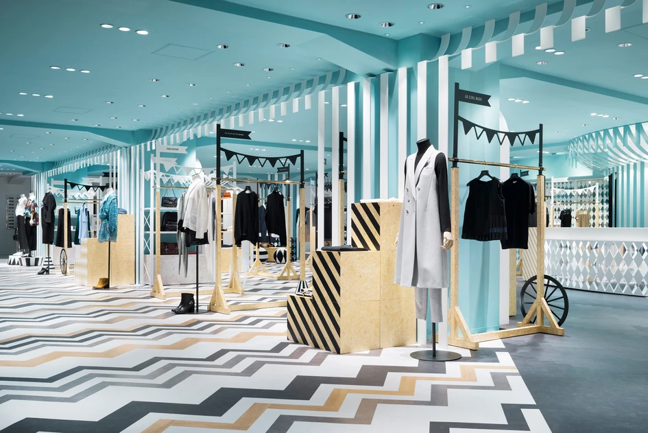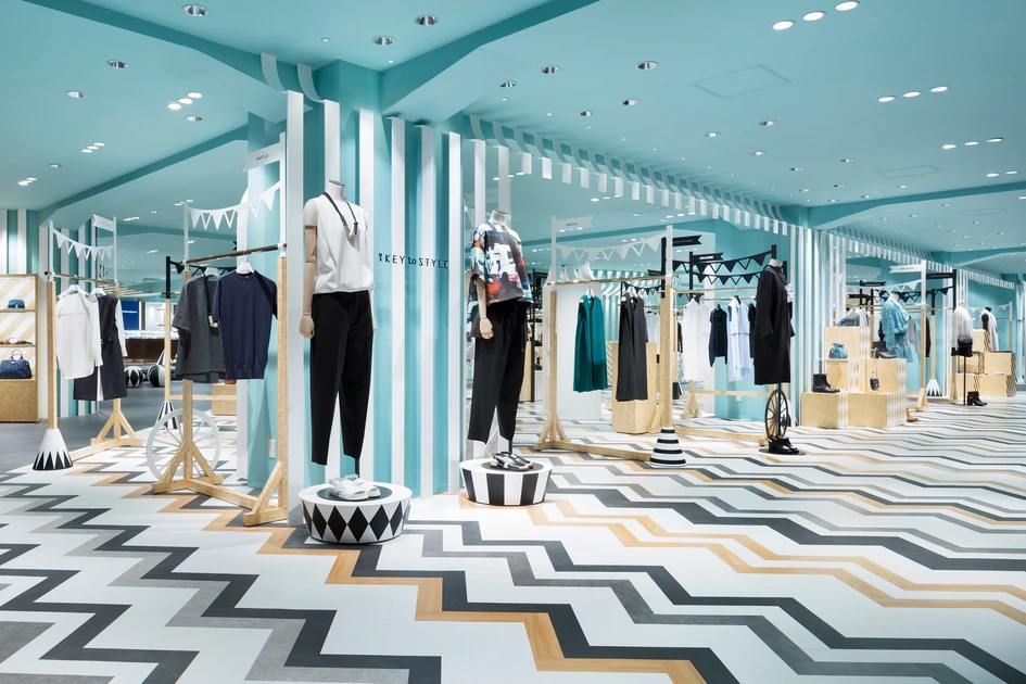 “Key to style” is the women’s fashion floor within the main building of the Seibu Shibuya department store. It is connected by a walk-way with the “COMPOLUX” floor on the third floor of the annex building that we designed in 2013, and has a more casual feel by targeting the young customer. We wanted to create a dynamic setting while maintaining the connection with the “COMPOLUX” area that was inspired by a cozy European park. Hence, we decided on the “mobile amusement park” that is held at parks as the design theme. The colours are based on a monotone colour scheme, while to add some accent the ceiling was coloured blue and wood was used in some parts, which helps to enhance the colour and the sense of texture of the products. The design of the sales area is inspired by a circus tent, and the collection of the brands are arranged to give the impression of market stalls.