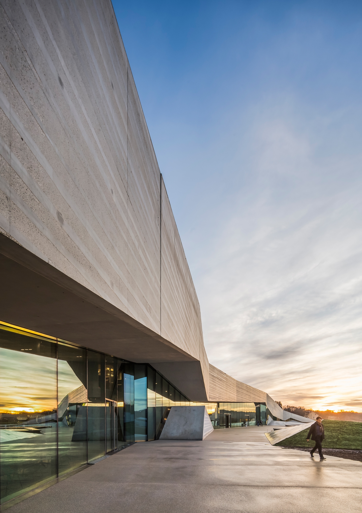 The design of the building has been shaped by two principal sources of natural light. One is created by a lateral cut in the landscape that lifts and separate the two planes, pulling them apart to generate a vertical facade where the light enters the building horizontally. The other is a deep cut along the spine of the building, which reveals the horizontal glass surface of a skylight and allows light in vertically. Throughout the course of a day, visitors experience the various shades and intensities of light that are filtered through the roof glass and the façade.