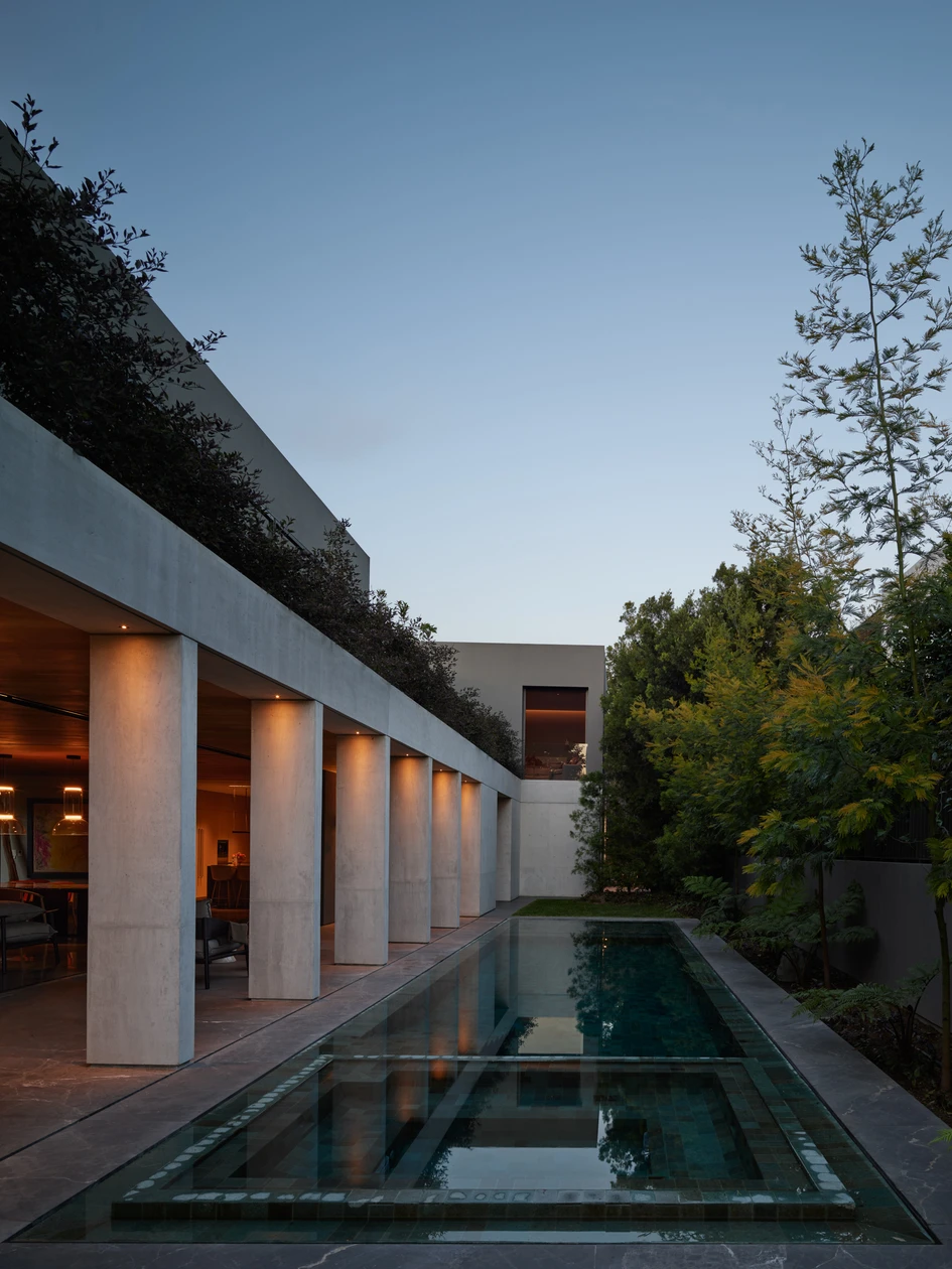The project begins with this social heart as described earlier. It is a very functional house, somewhat rationalist too (it can be seen in the language of the house and its structure and modular rhythm) being a very simple house to understand. Basically, we decided to group the spaces that needed more privacy, bedrooms, bathrooms, studies, etc. In a certain orderly way that embraced the main void, which is the social area, generating a very interesting route accompanied by natural lighting and ventilation in the form of patios and reflecting pools, for example.