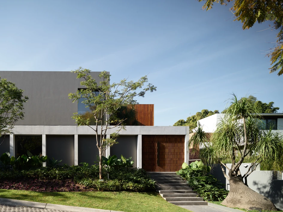 To give a greater sense of order and coherence to all these spaces, we created a portico that, in addition to being a structure, is the belt that ties all these spaces and becomes this important living space, before reaching the garden that surrounds the house. This structural portico and the modulation of the house in its facades were considering the material and construction process of exposed concrete, this modulation dictates the rhythms of open spaces, floors, and other details from the exterior to the interior. This type of relationship between quartering, finishing and other coincidences in the materials we believe are relevant to give the necessary importance to all the details of the house, from a larger scale to the smallest.