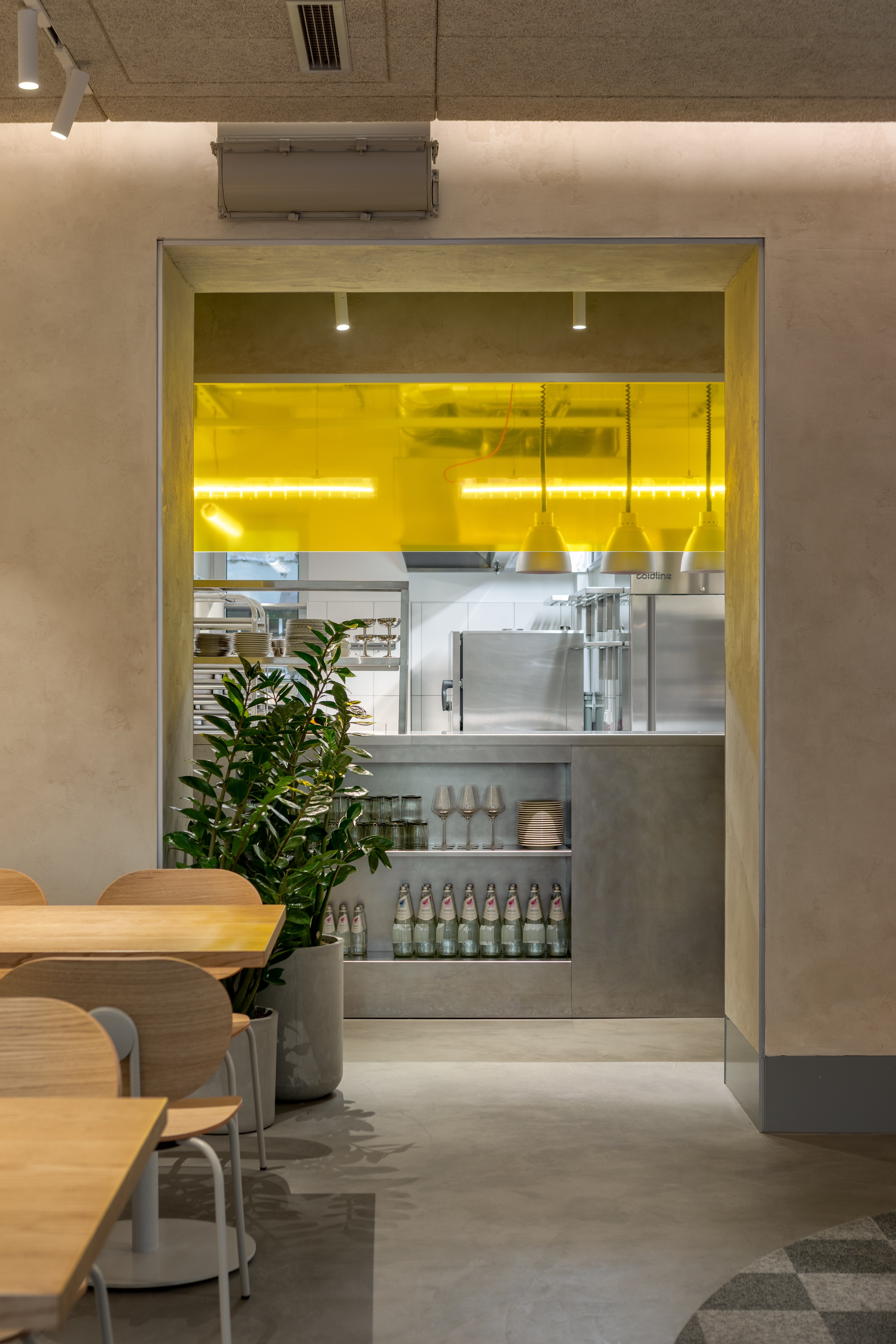 To the left of the bar is the serving area, with its countertop and inner bar made of stainless steel, as well as a custom-made side station next to it. The yellow partition in this area visually echoes the yellow accents found throughout the main hall, including the yellow glass blocks of the bathroom. It also separates the cold light needed for the operational area of the kitchen.