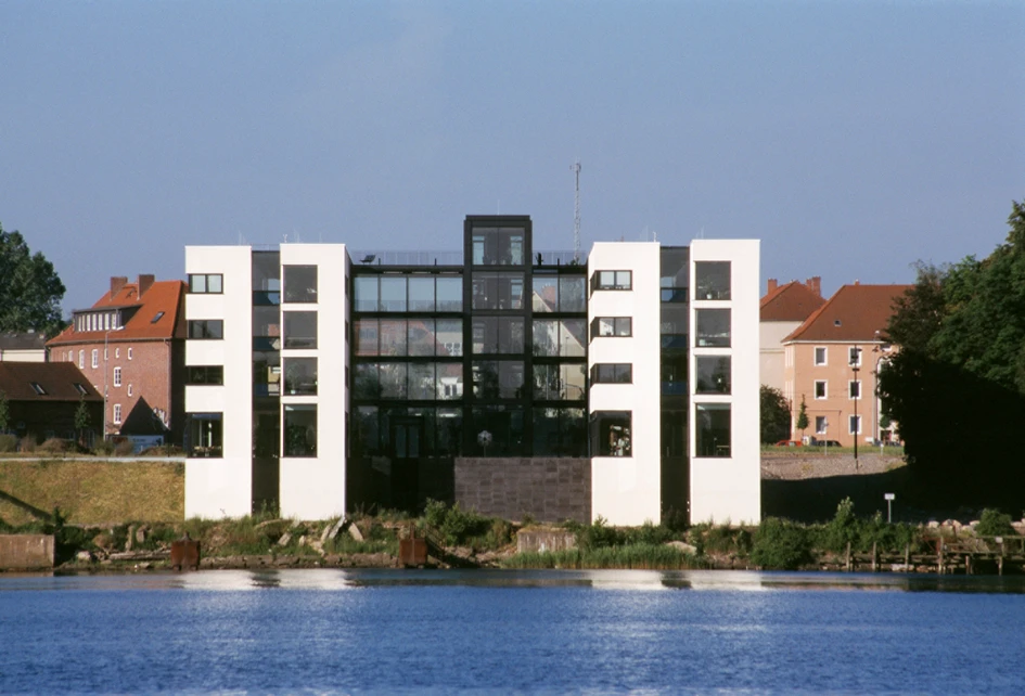The building site is situated in a development area by the river. The development respects its proximity to the old town centre and yet at the same time creates an authentic and modern expression towards the river and the green area to the north. The location is characterized by a structure of right angles to the river, rather similar to the ancient Hanseatic warehouses with their characteristic gables.