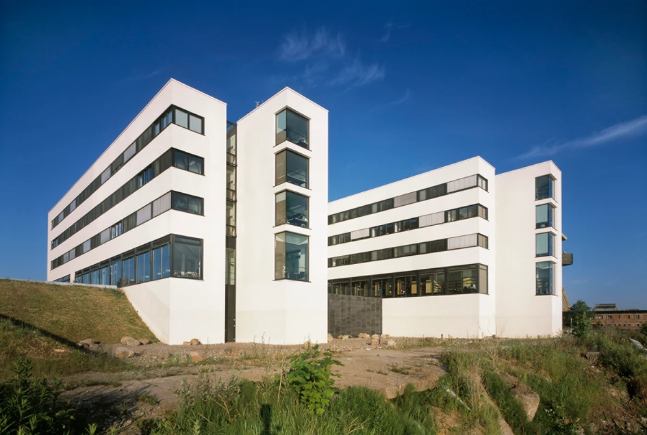 The institute compares to two parallel ‘warehouses’ creating a space between them. The buildings are covered with a bright, nordic sandstone. Natural light cuts through the building volumes and into their internal court yard. The central room has light, transparent facades facing both the city and the river.