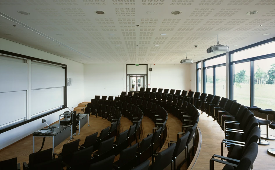 The three conference rooms placed in a separate volume suspended into the large central room add an architectural accent - an urban focus point on the river bank.
