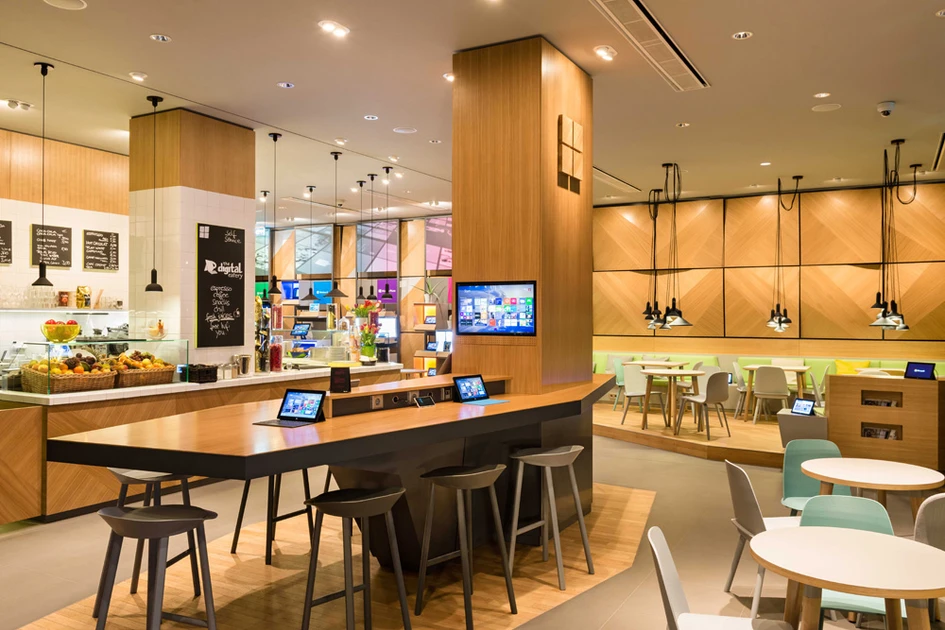The “Digital Eatery” is the heart of the new location and the first public point of contact with the brand Microsoft. Here the organization sees itself as “host and meeting point for the digital society” and invites you to “test its products in a relaxed atmosphere” says Henrik Tesch, director of political and social engagement for Microsoft Germany.