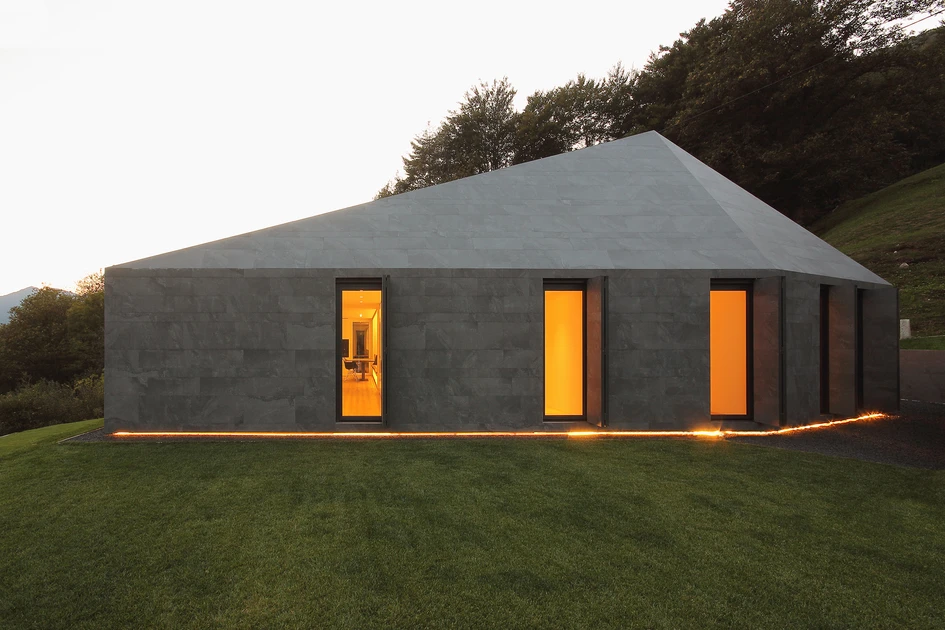 Il progetto sviluppa sapientemente il tema della casa con copertura a falde, così come richiesto dal regolamento edilizio, attraverso un linguaggio di chiaro segno contemporaneo. L’inedita soluzione sperimentata per l’involucro ceramico, che riveste completamente ogni superficie verticale e inclinata, definisce un’architettura monolitica, monomaterica e monocromatica, che si inserisce con coerenza nel contesto naturalistico. L’impianto costruttivo e lo studio accurato dei particolari valorizzano a pieno le potenzialità compositive, prestazionali e applicative del grès porcellanato di ultima generazione.