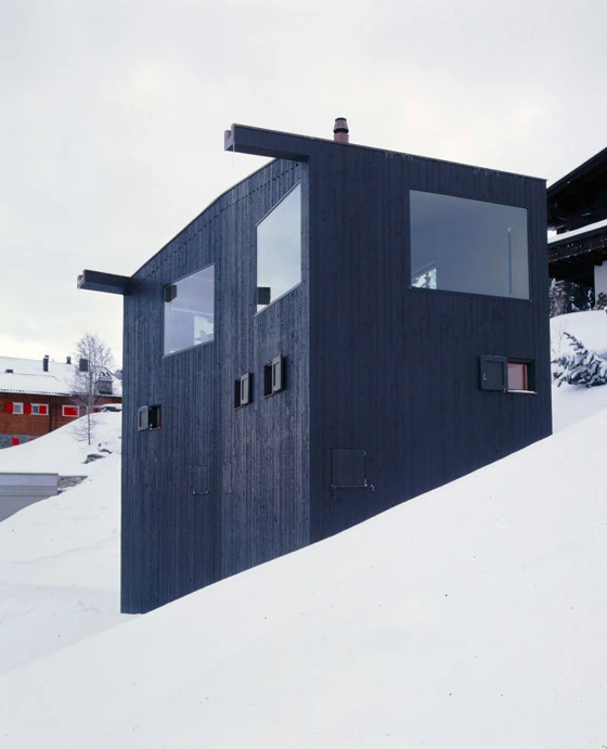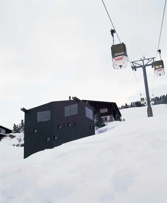 Durch seinen Knick passt sich der Baukörper der Kurve des Hangverlaufs an. Äusserlich variiert das Haus das omnipräsente Thema des Chalets mit seiner dunklen Holzschalung und kleinen Fensteröffnungen zum Bild eines Chaletturms mit riesigen Panoramafenstern.