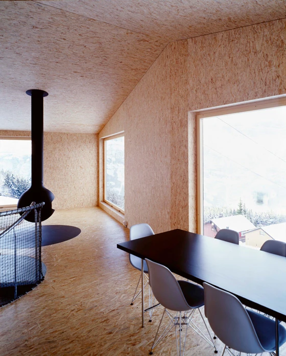Im Wohngeschoss kehrt die vertraute Form des Chalets wieder. Die Proportionen des Raums stehen jedoch im Spannungsverhältnis mit der Dimension der riesigen Panoramafenster.