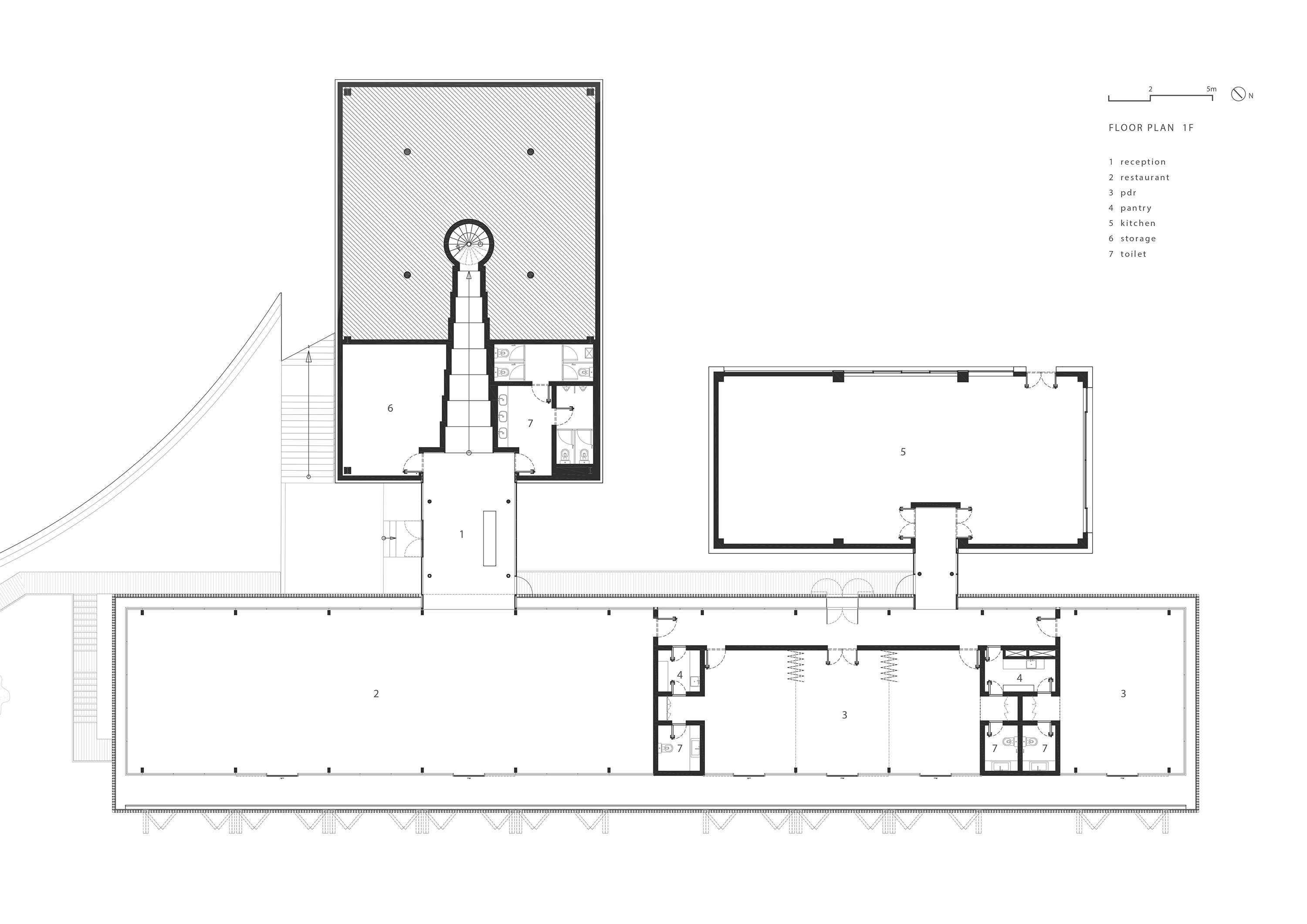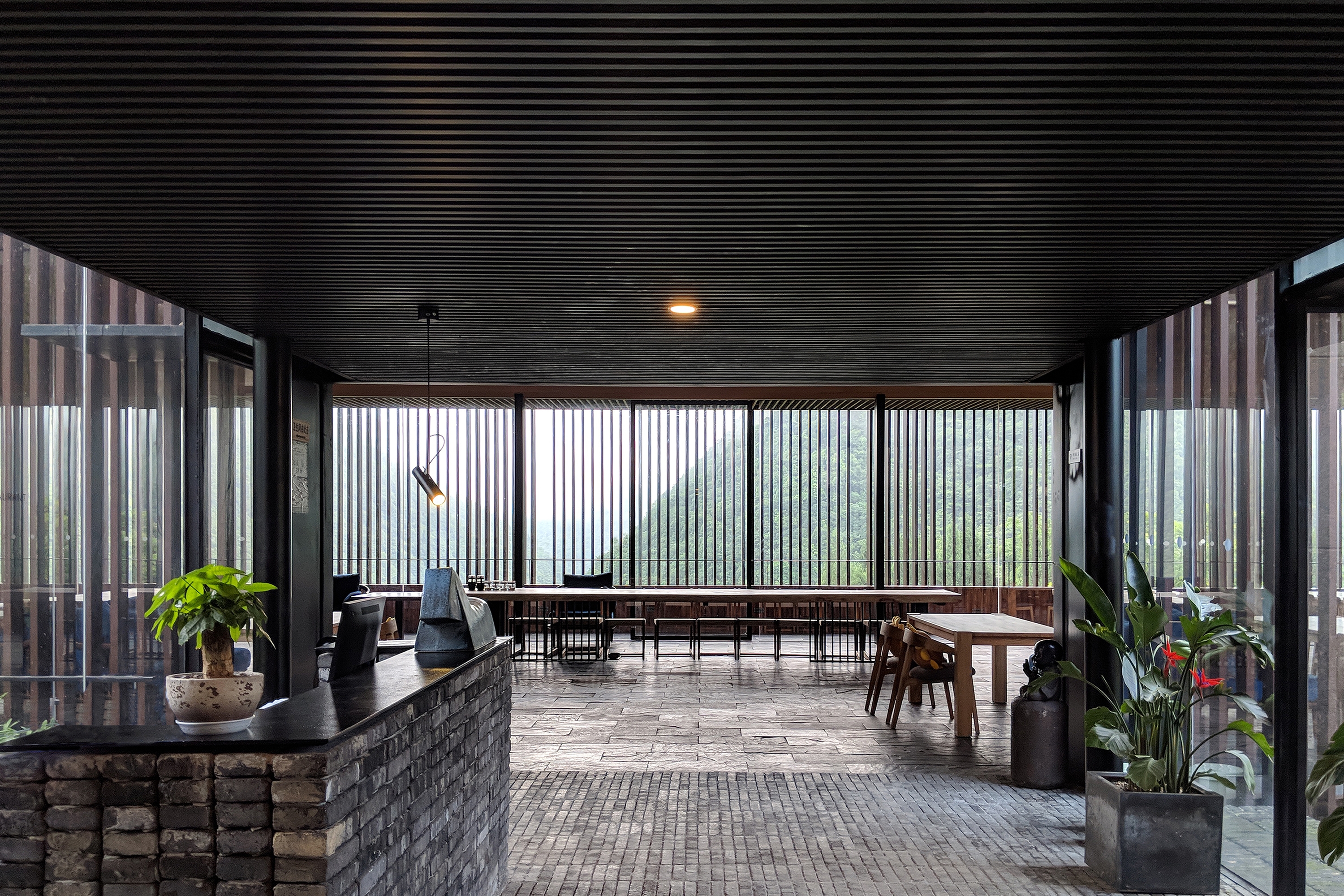 The project site is located on a steep slope that lies against a bamboo forest and faces the valley and mountains. The bar is set at ground level, while the restaurant sits lower along the hillside. The composition of the architecture conforms to the topography in order to enable unshielded views of the surrounding landscape to infiltrate the interior space of both the restaurant and the bar. The external facades of the two volumes are enclosed by dark-colored louvers, which integrate the building with the surrounding natural landscape.