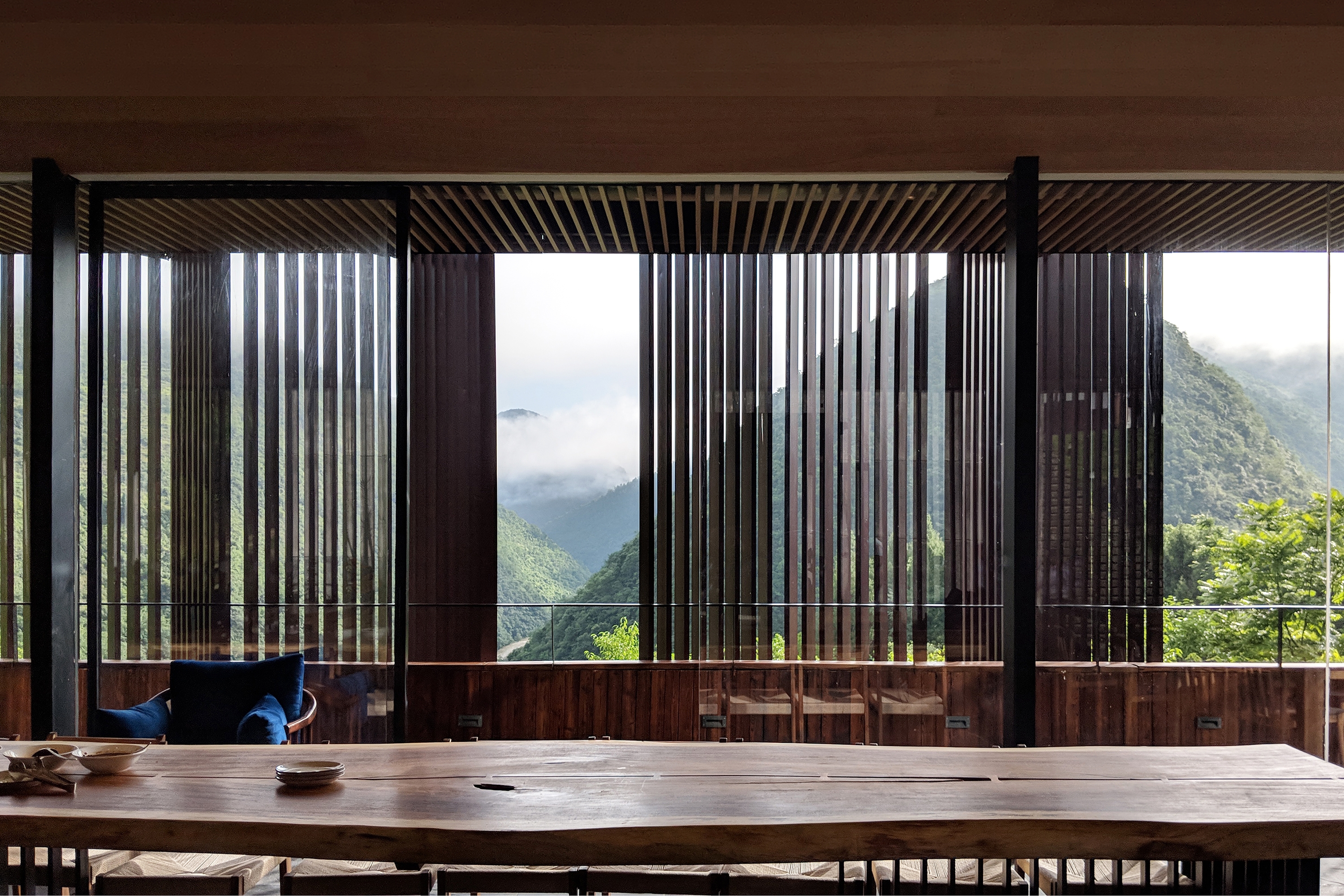 The main entrance is on the restaurant floor. The façade of the restaurant is a combination of glass and vertical louvers, thereby introducing soft natural light into the space while retaining the sense of being immersed in the mountain scene. The vertical louvers at the side of the valley are mounted on folding frames and can open entirely when desired; when opened, they embrace the lofty mountain and the mist and can endow the dining environment with different atmospheres according to the climate and season.