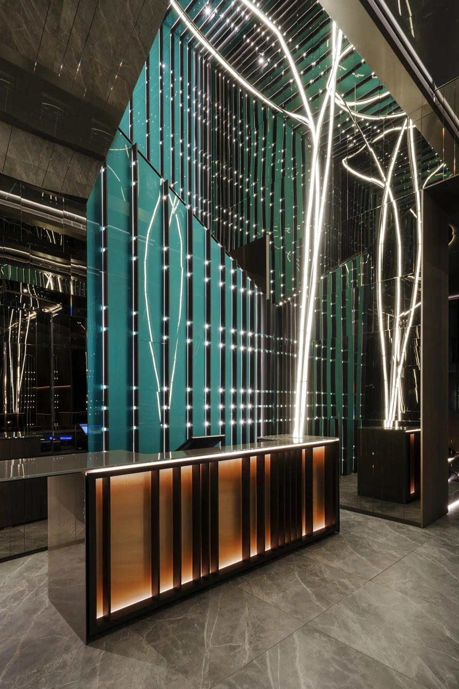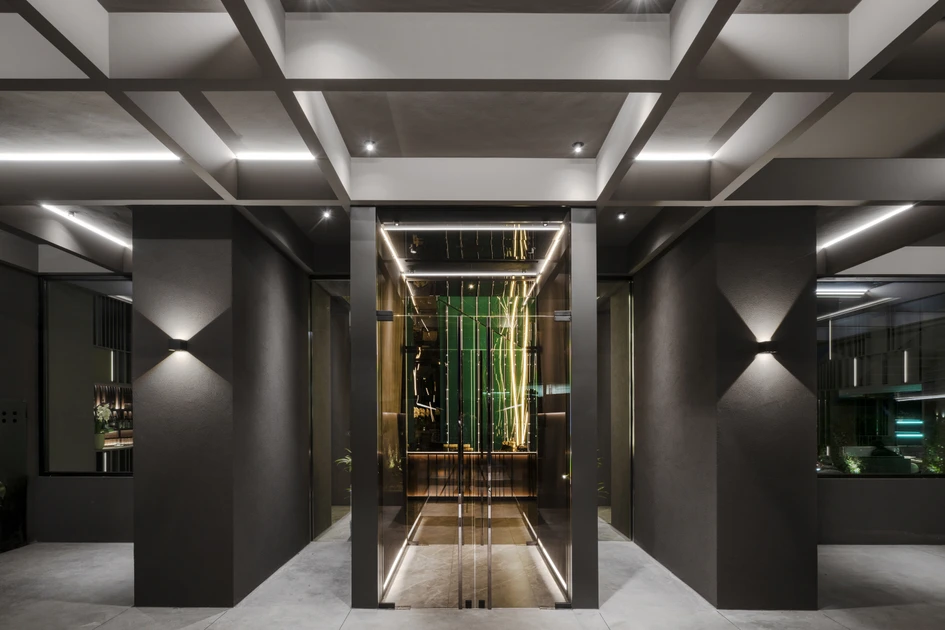 Caratterizzato dalla parete di fondo in vetro laccato verde smeraldo retroilluminato e decorato dalla scansione parametrica di una fitta rete di punti luminosi, il complesso del vano scale funge da spettacolare quinta scenografica, riflettendo il contenuto all’infinito, attraverso gli specchi scuri che rivestono le pareti laterali. L’effetto è una dilatazione dello spazio, che spinge con forza i limiti della percezione.