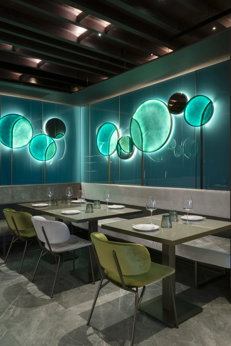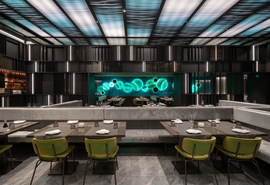 MOYA è un ristorante di cucina asiatica contemporanea, distribuito su un'area articolata di oltre 1000 metri quadrati, divisa su due piani. Si distingue per il forte impatto del volume di ingresso, in cui un'installazione luminosa, sinuosa e verticale domina l'ampio spazio, sviluppandosi alla massima altezza e salendo al livello superiore.