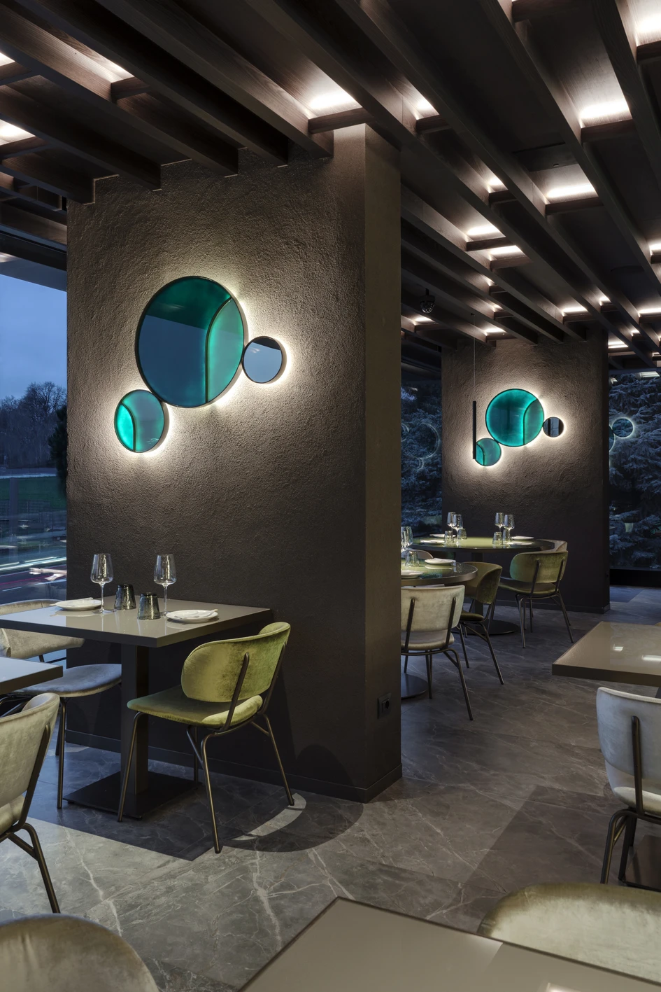 Nelle ampie sale da pranzo vetro, legno e tratti luminosi decisi sono i protagonisti di un racconto cromatico che gioca su contrasti di colore essenziali, ispirati agli elementi naturali. Le lampade a parete, su disegno, anche’esse in vetro retroverniciato, costituiscono un elemento decorativo dal sapore quasi nostalgico, retrofuturistico.