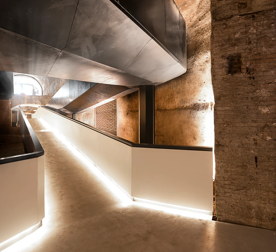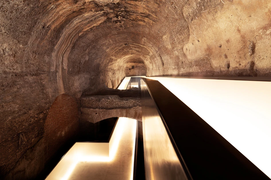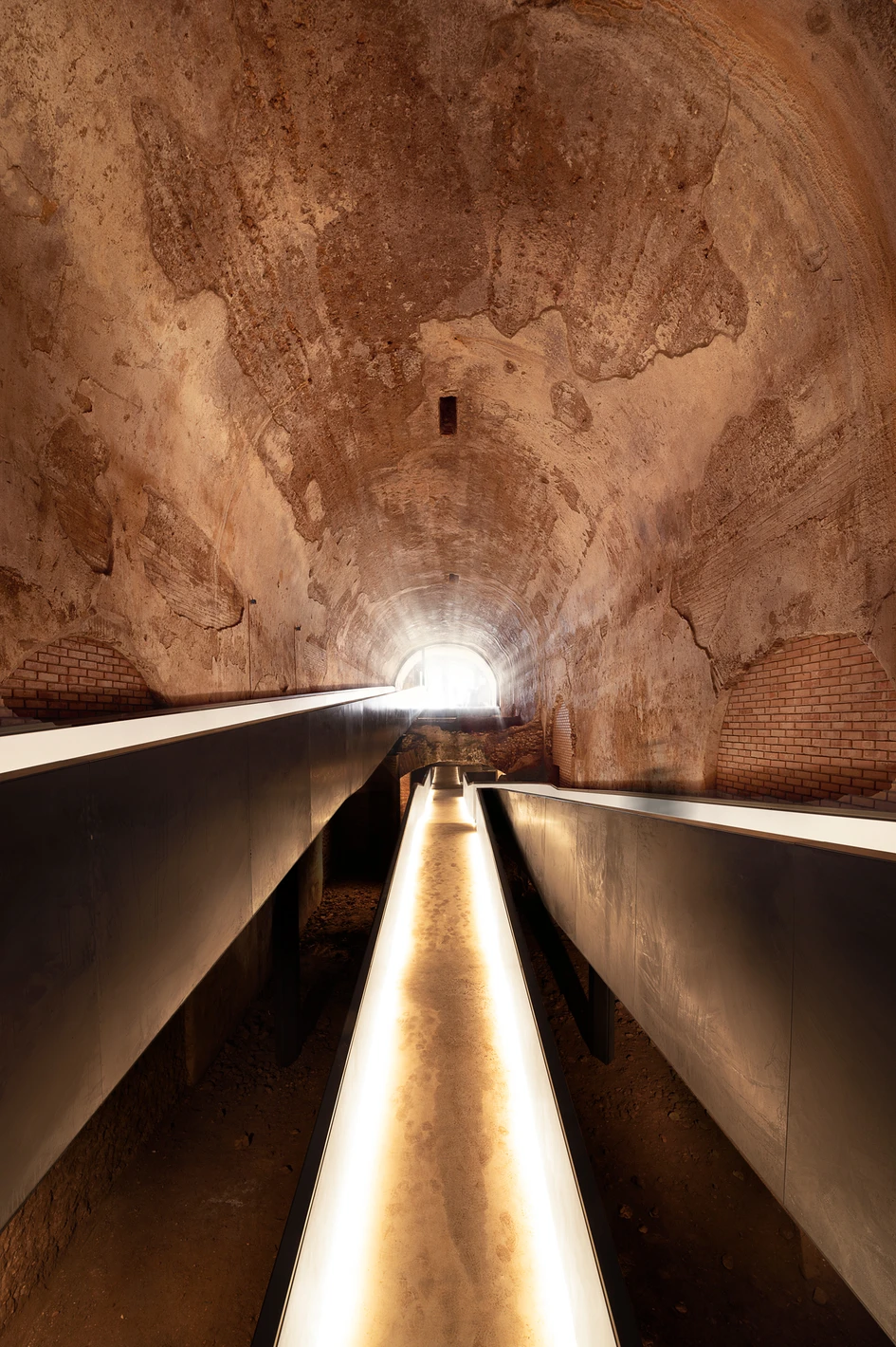 The pedestrian walkway is part of Gallery III - already freed from earth years ago and conceived as a dark but well-defined space - which, illuminated by a light guide that accompanies the visitor, suggests the idea of a light path through the ruins, ideally concluded by the large oculus of the vault of the Octagonal Room, the final destination of the itinerary.