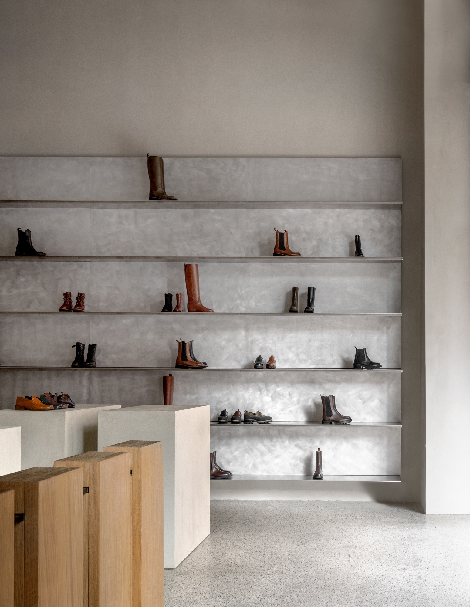 “The intention to form a retail space resembling that of an artist’s atelier, combined with a simplified and stylized warehouse feeling is enhanced by the many freestanding plinths, displaying shoes as artwork in a versatile, yet harmonized, material palette.” – Jonas Bjerre-Poulsen, Norm Architects