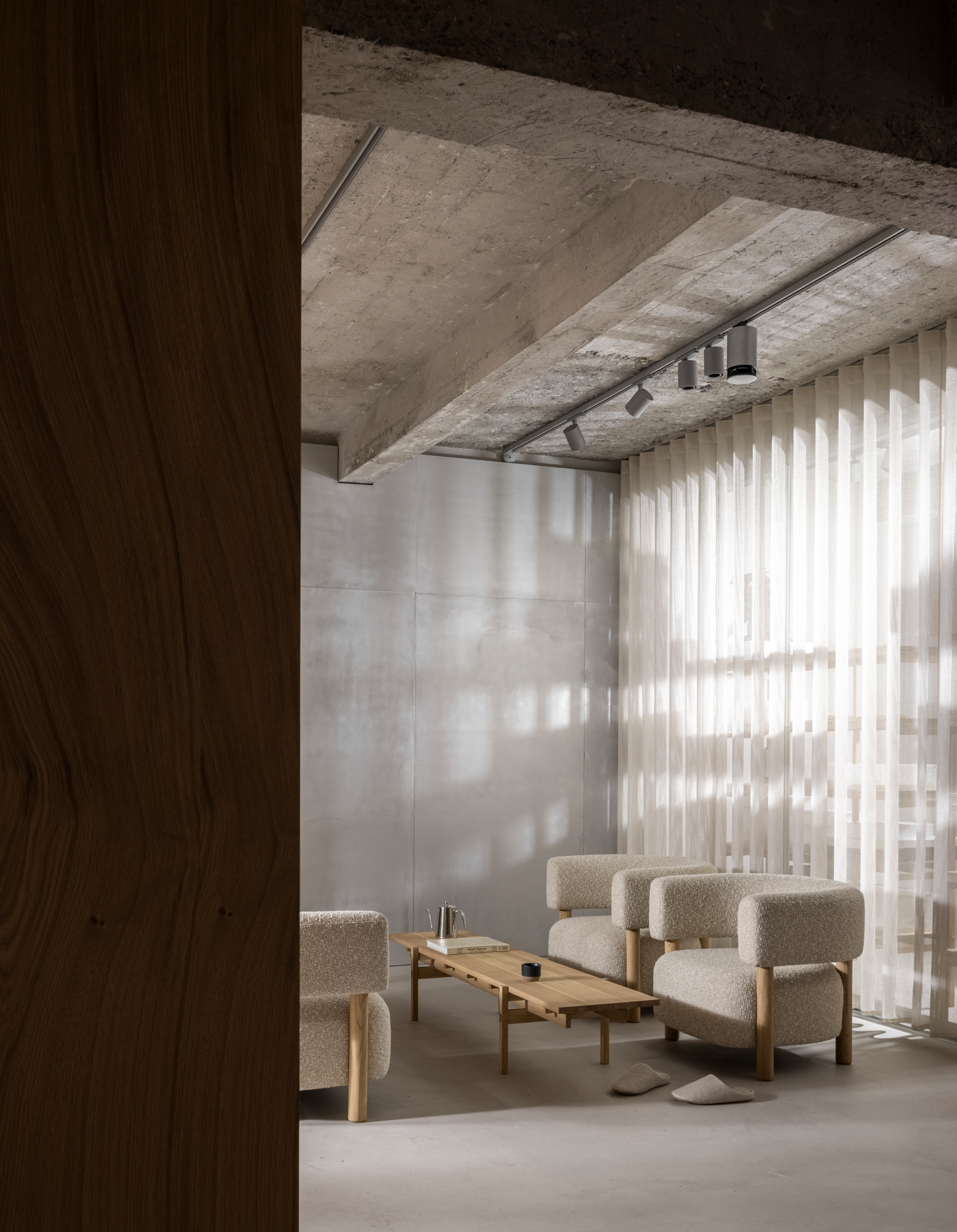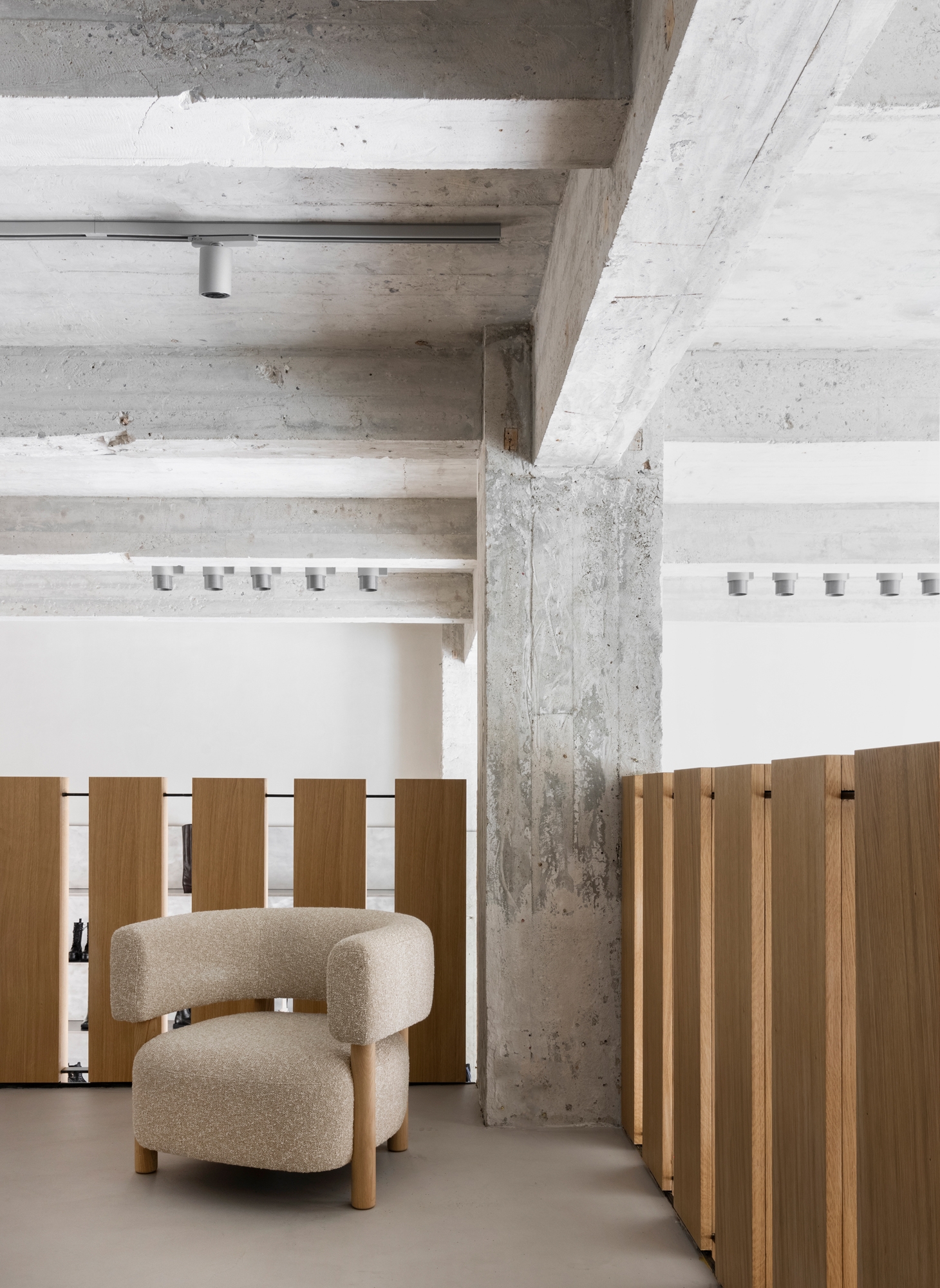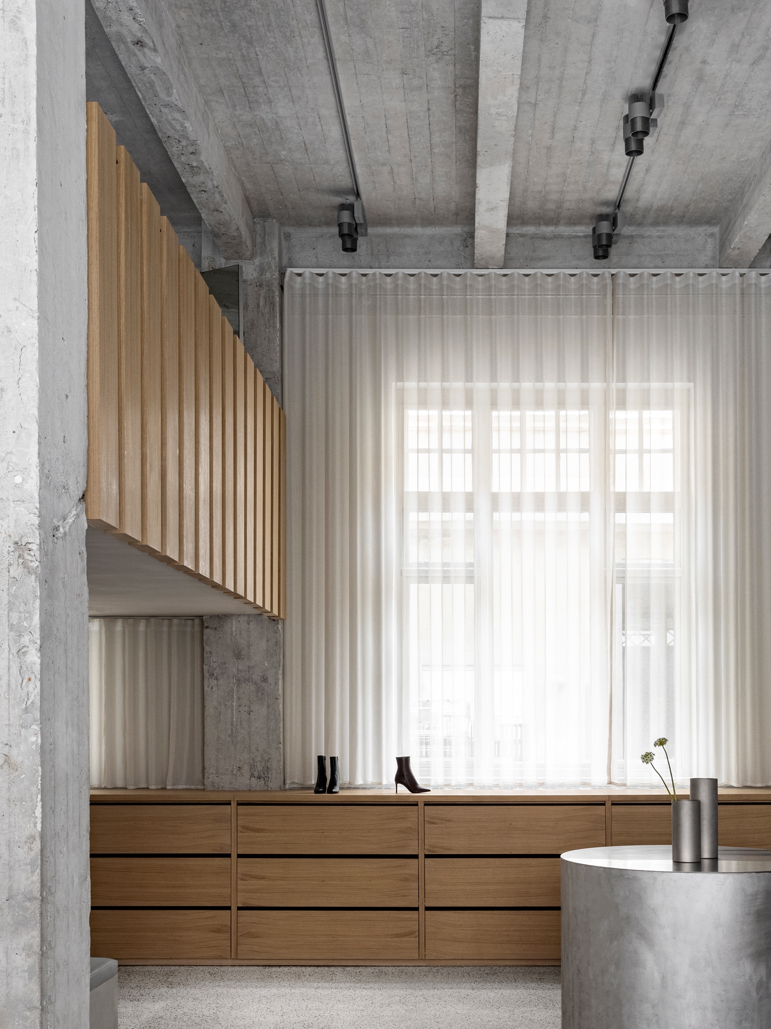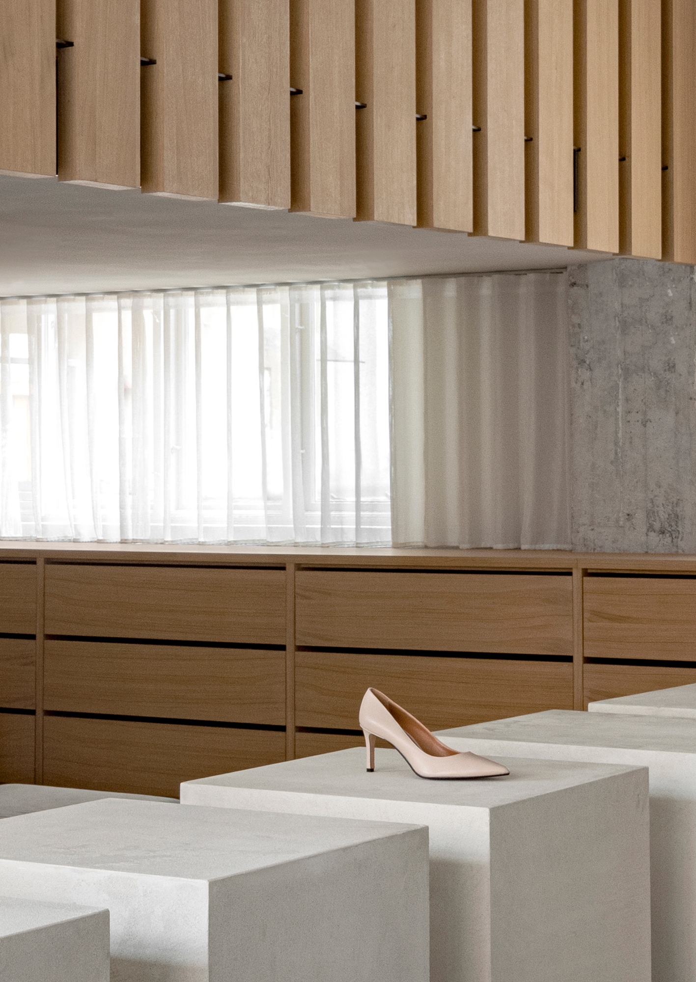 This meeting of different functionalities and atmospheres is not only marked by the different levels in the space – it is just as much reflected in the meeting between materials; in the way that the soft curtains brush up against the raw concrete walls; in the way that the light and delicate Japanese oak wood furniture sits on top of the traditional black-and-white terrazzo flooring and in the way that the oversized and rustic clay podiums showcase fine handmade shoes with refined leather details and precise stitching.