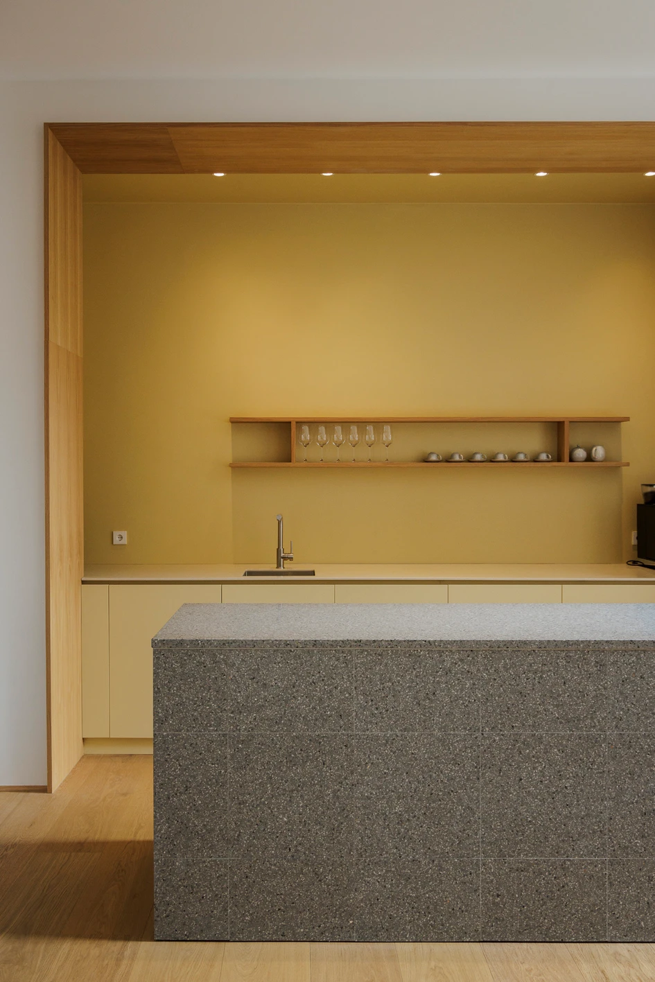 The entire space is carefully framed in several directions, enhancing the architectural character. Key rooms are defined by high wooden plinths that rise from the floor to transform into elegant wooden paneling. Functions and spaces are further divided by tall oak frames, subtly delineating areas while maintaining visual continuity.