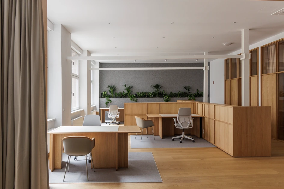 This project, designed by van Baal interior design and Tomasz Budnicki, is located in the heart of Berlin’s Mitte district. It creates a multifunctional workspace that fosters collaboration and tranquility. The interior integrates natural materials such as wood, terrazzo, fabrics, and rough plaster, softened by a carefully curated palette of soft colors and lush greenery. Together, these elements create an environment that is both inviting and efficient. Light wood tones, subtle gray textiles, and muted accents of warm yellows establish a serene and timeless aesthetic, all further enriched by the softening presence of plants.