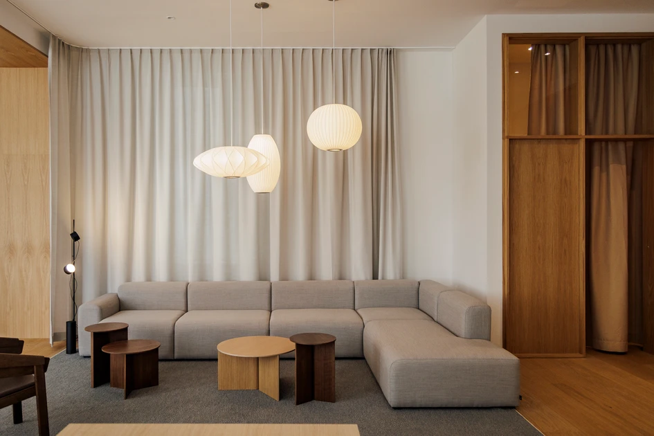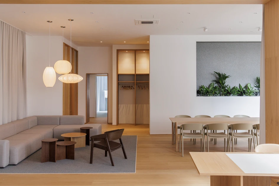 The design highlights several key areas. A long communal meeting table, surrounded by understated chairs, is framed by recessed shelving and muted backdrops to encourage focus and collaboration. The lounge area offers a more informal setting, featuring comfortable sofas, textured rugs, and sheer curtains that create a relaxing atmosphere. Sculptural pendant lights add a layer of visual interest to this space. The workstations are crafted to balance privacy and productivity, with low wooden dividers, ergonomic chairs, and integrated greenery fostering comfort and calm.