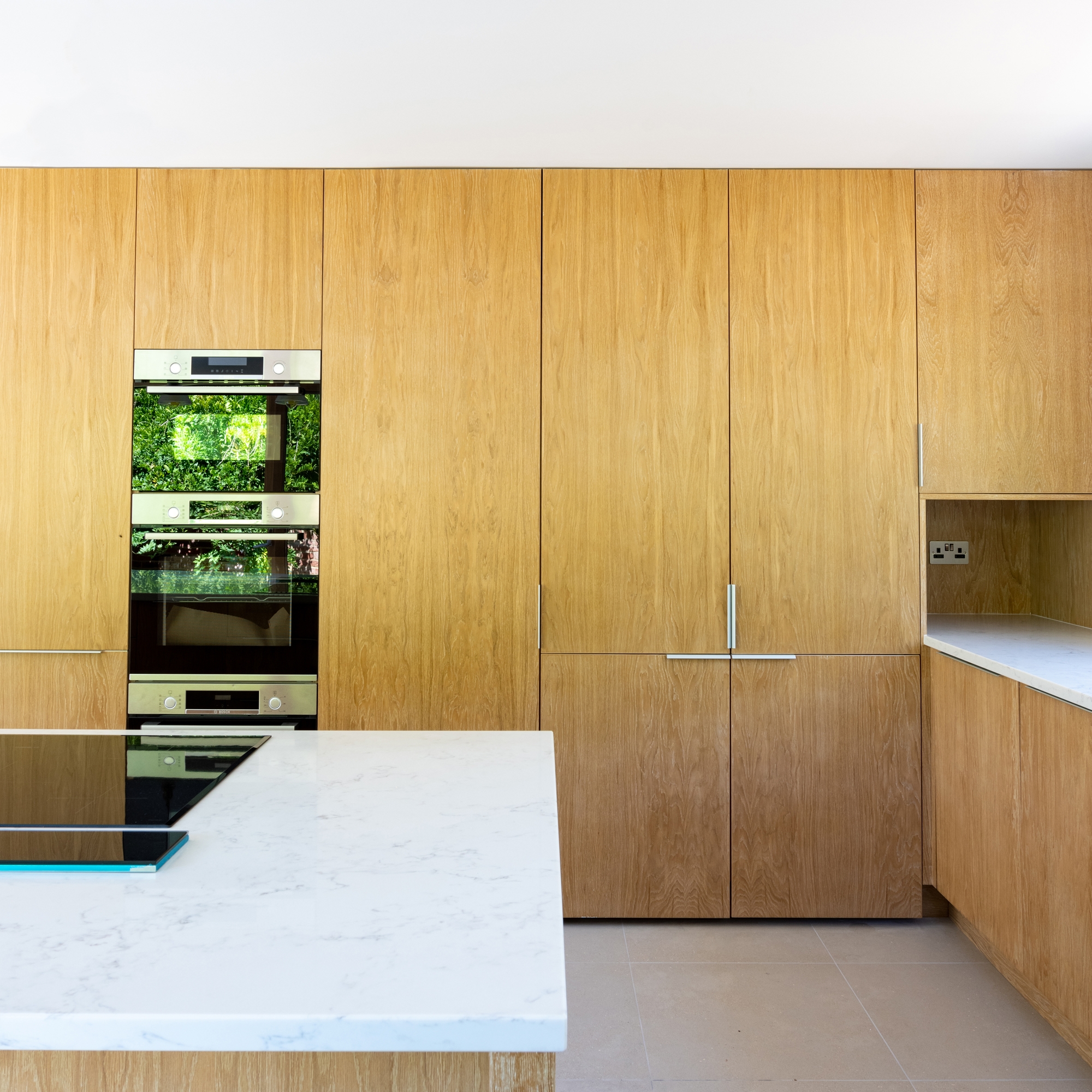 The extension includes a new guest suite with bedroom, bathroom and dressing area within the roof pitch, with large flat roof glazed dormers looking out across the gardens. The stair up to the guest suite has been positioned behind the kitchen, to give discrete access and appear as part of the bespoke kitchen furniture.